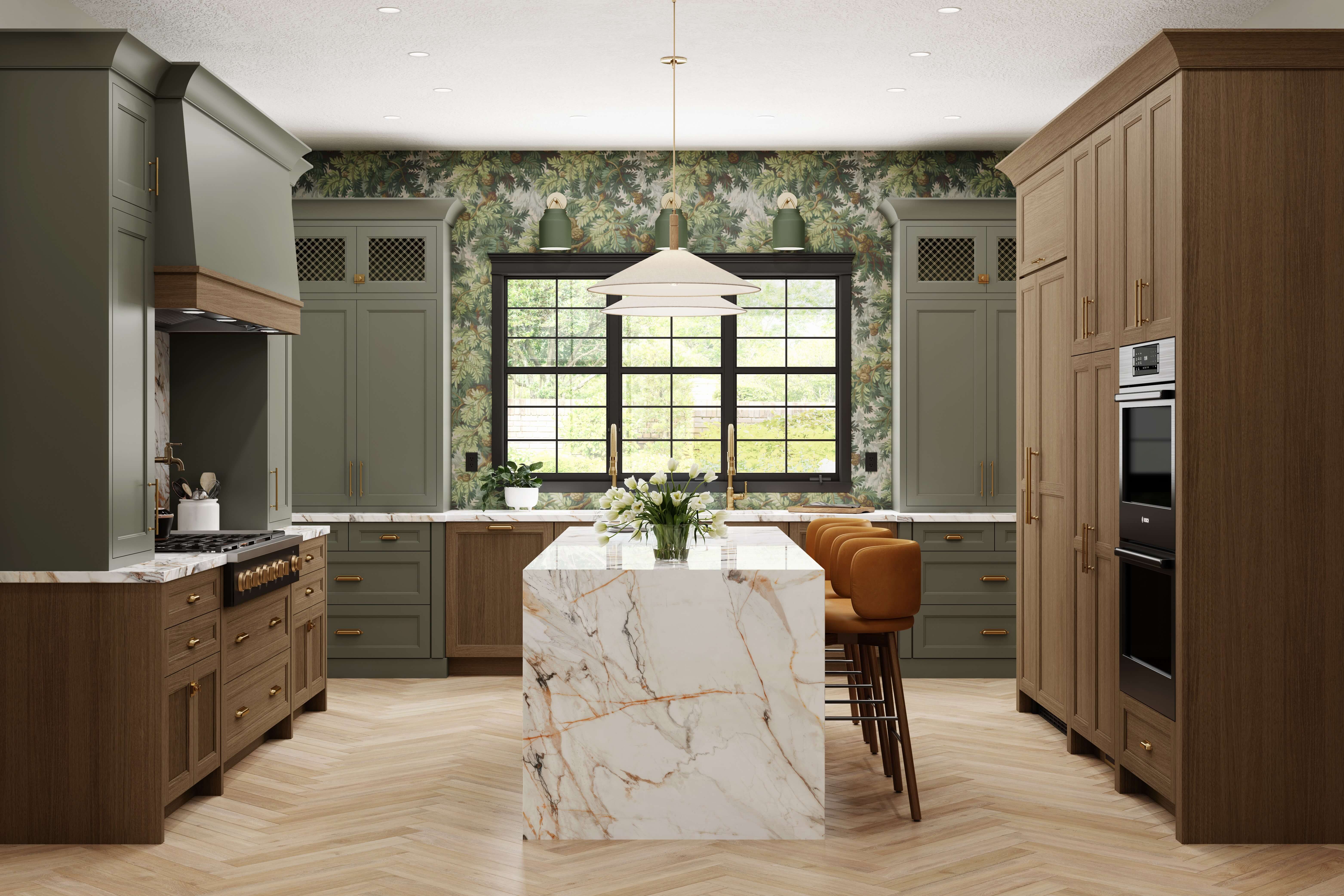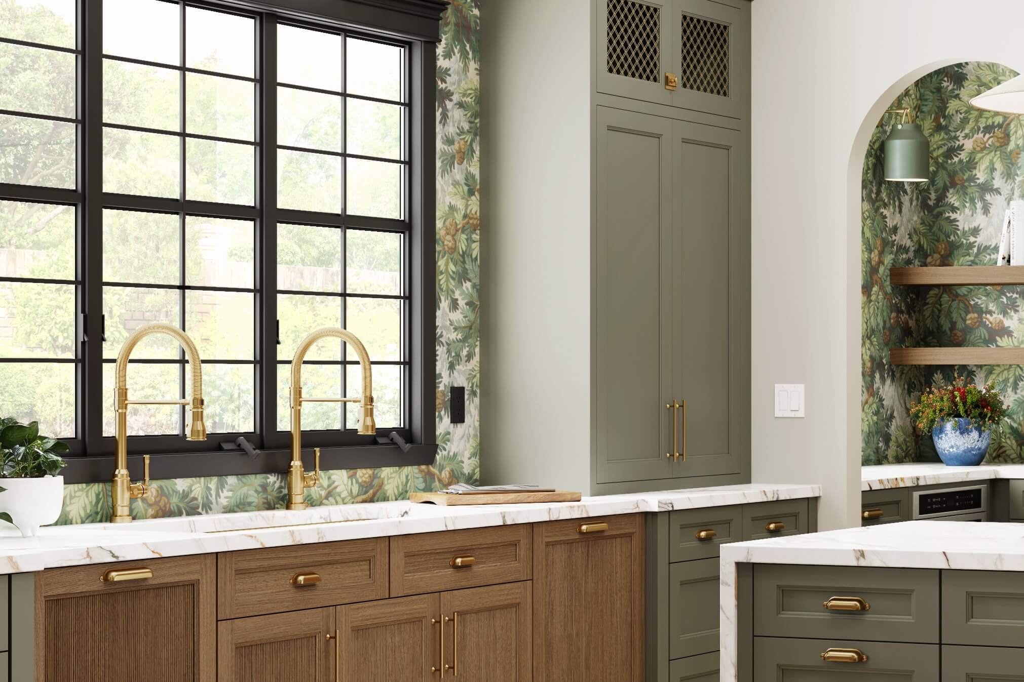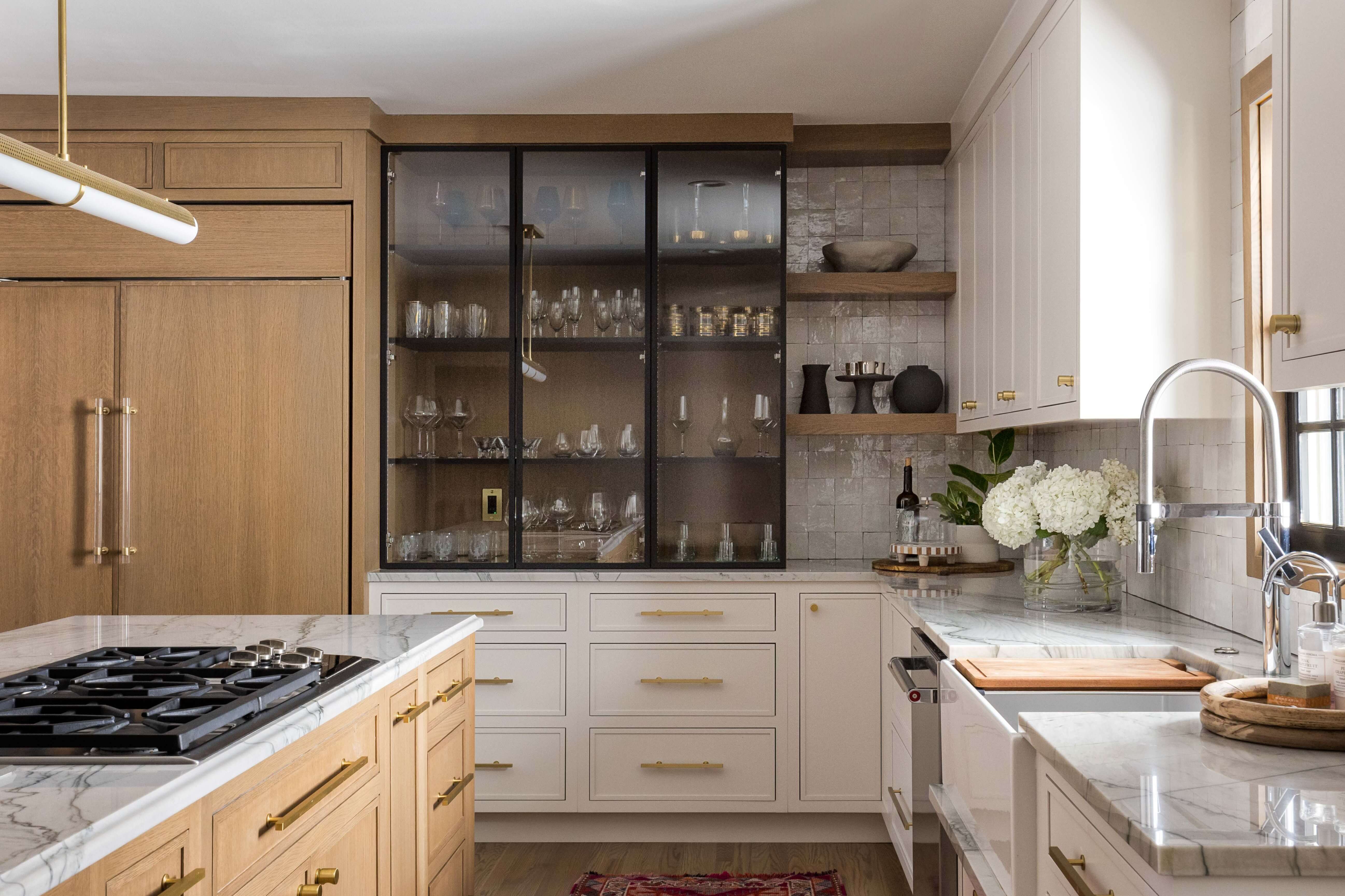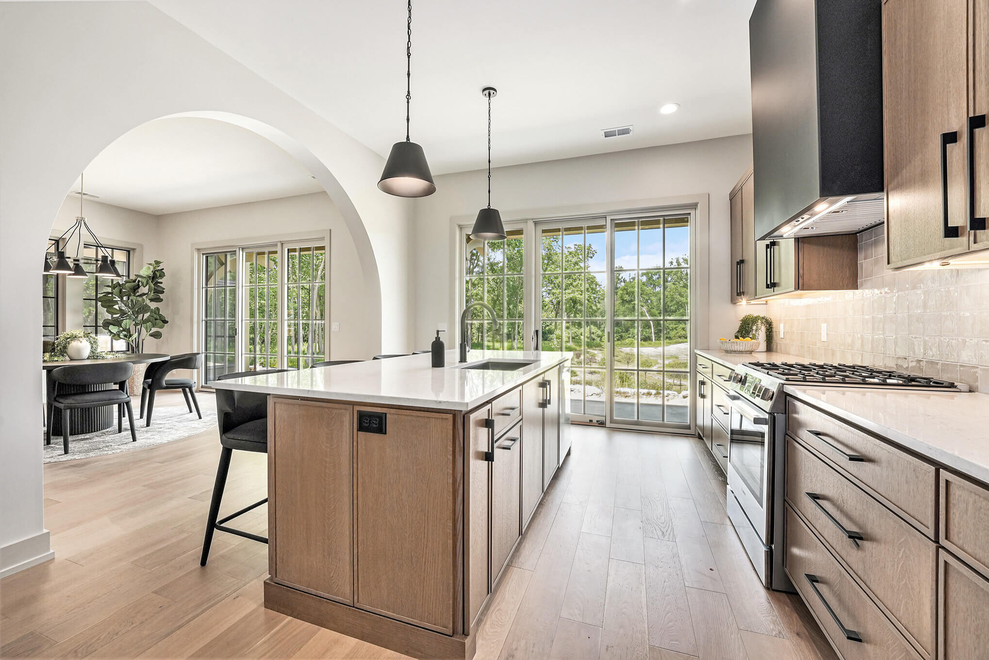Double arched doorways lead into the back kitchen of this project, featuring the Hudson shaker door in both Quarter-Sawn White Oak with Cashew stain and Dove paint.