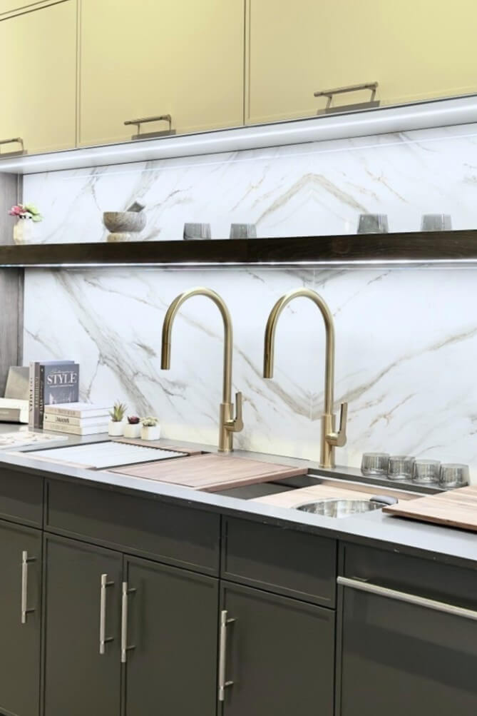 Beautiful gold double faucets are highlighted in this kitchen using our Alpine door style in White Cypress Laminate with black matte Onyx, Style 1 Aluminum Frame Door.