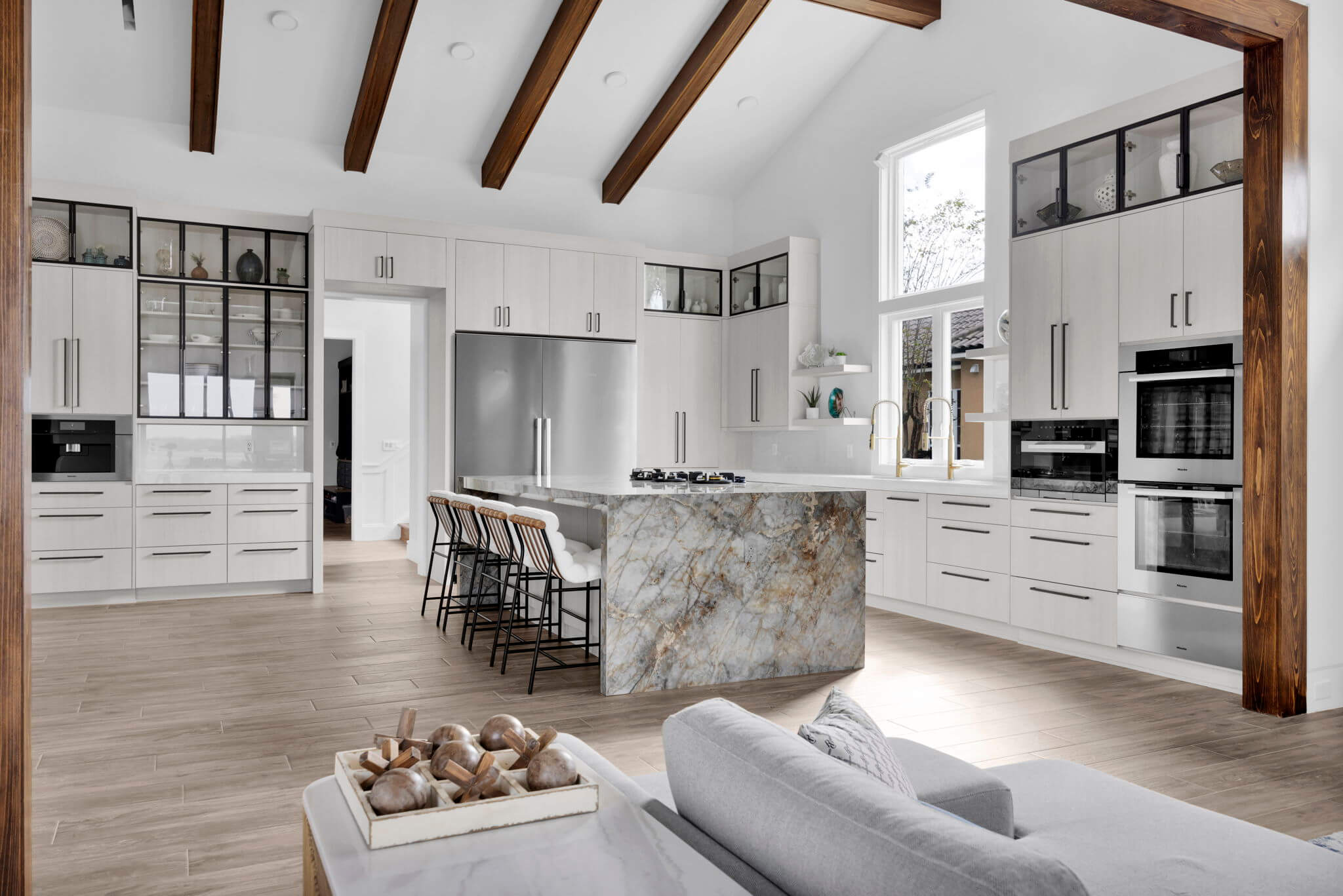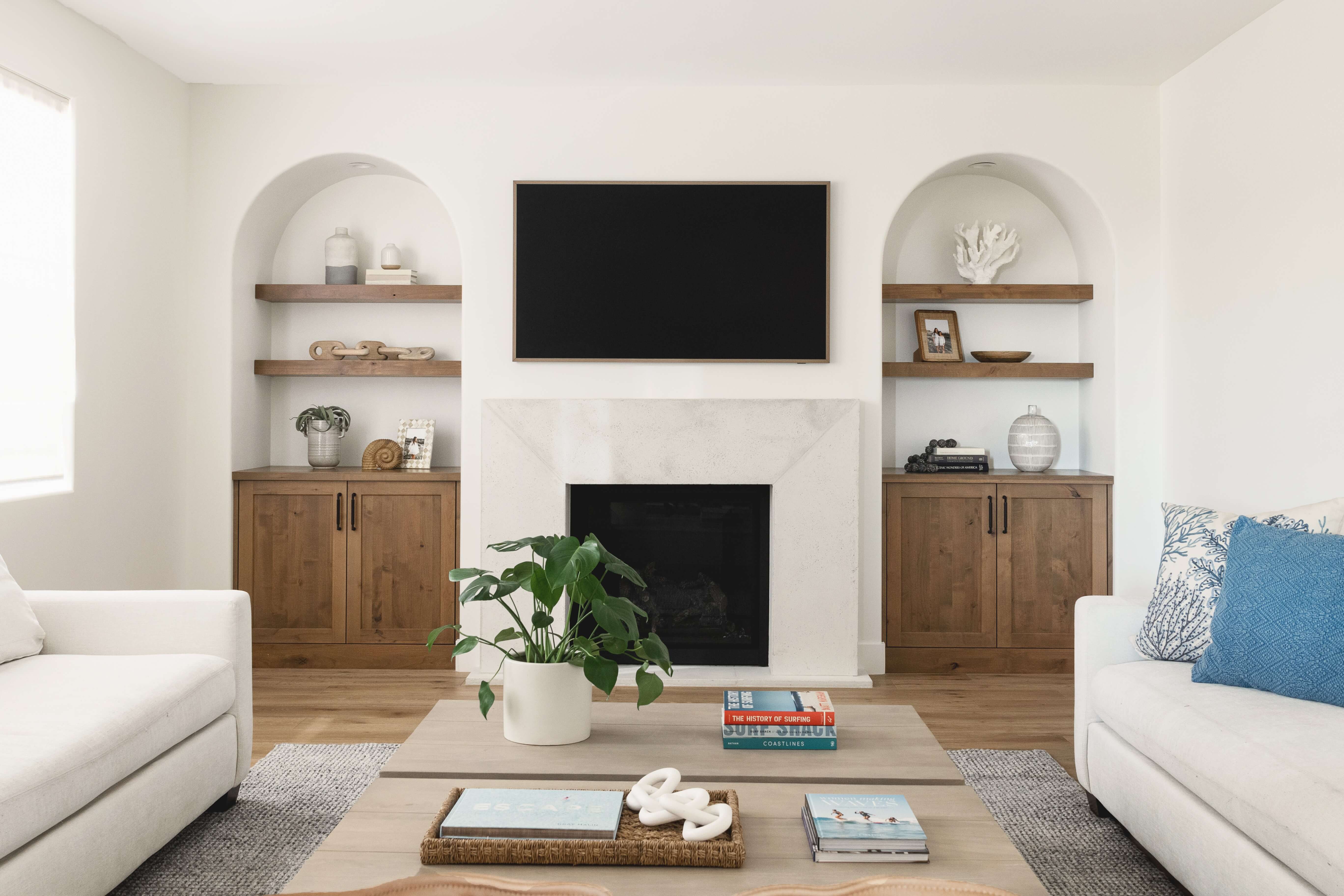 The below photos showcases arched openings used in this whole-home remodel by the talented team at Honeycomb Home Design in Arroyo Grande, CA. Each arched opening showcases the built-in cabinets with floating shelves created with the Carson panel and door in Knotty Alder with Sesame stain.