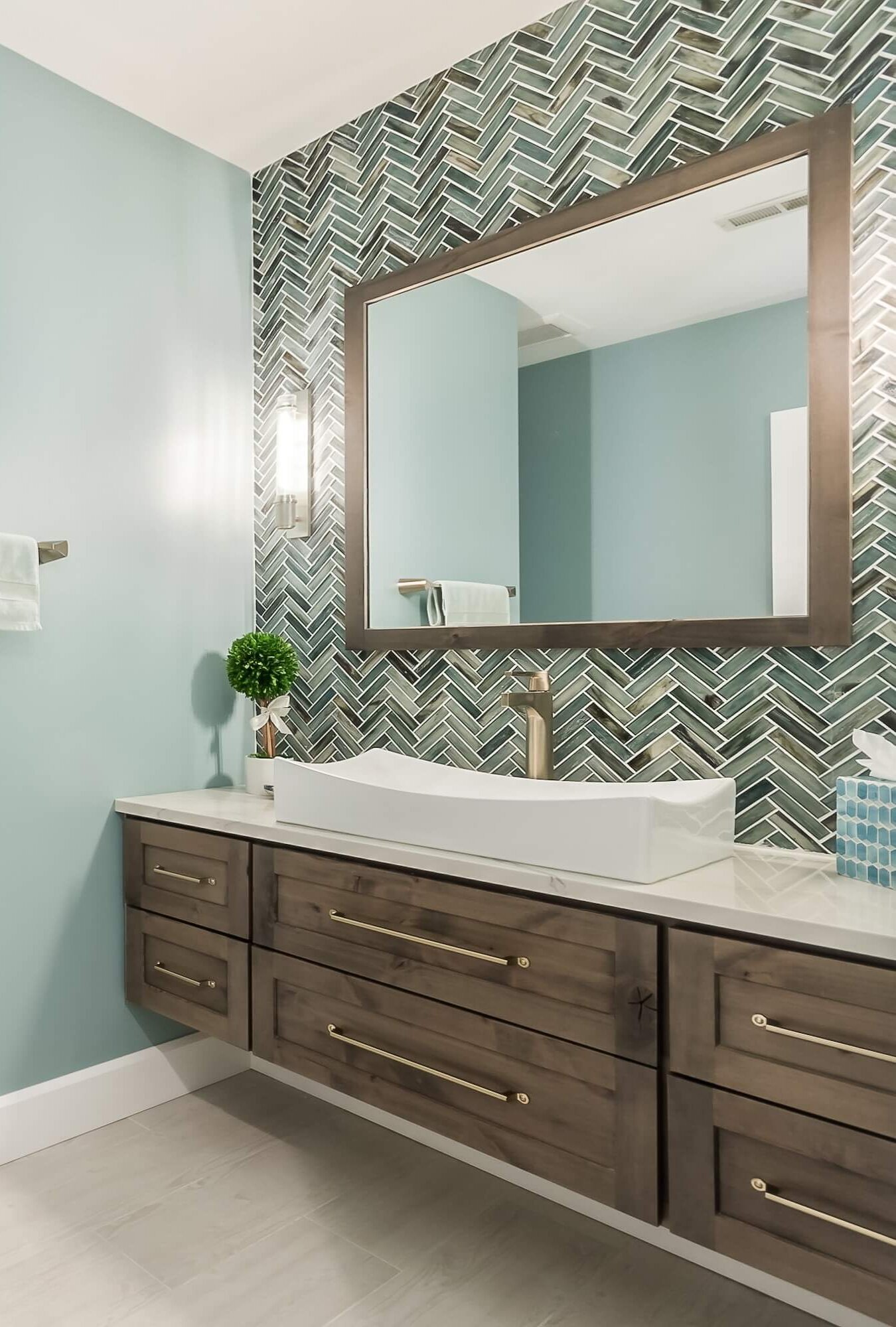 The below contemporary project features not only two faucets, but two different door styles as well. The contemporary styling of our Moda-Vertical door in Cherry with Butternut stain was mixed with the Dempsey door in Black paint. Add Aluminum Frame Door #1 in matte black Onyx and you get a striking contrast between the materials.
