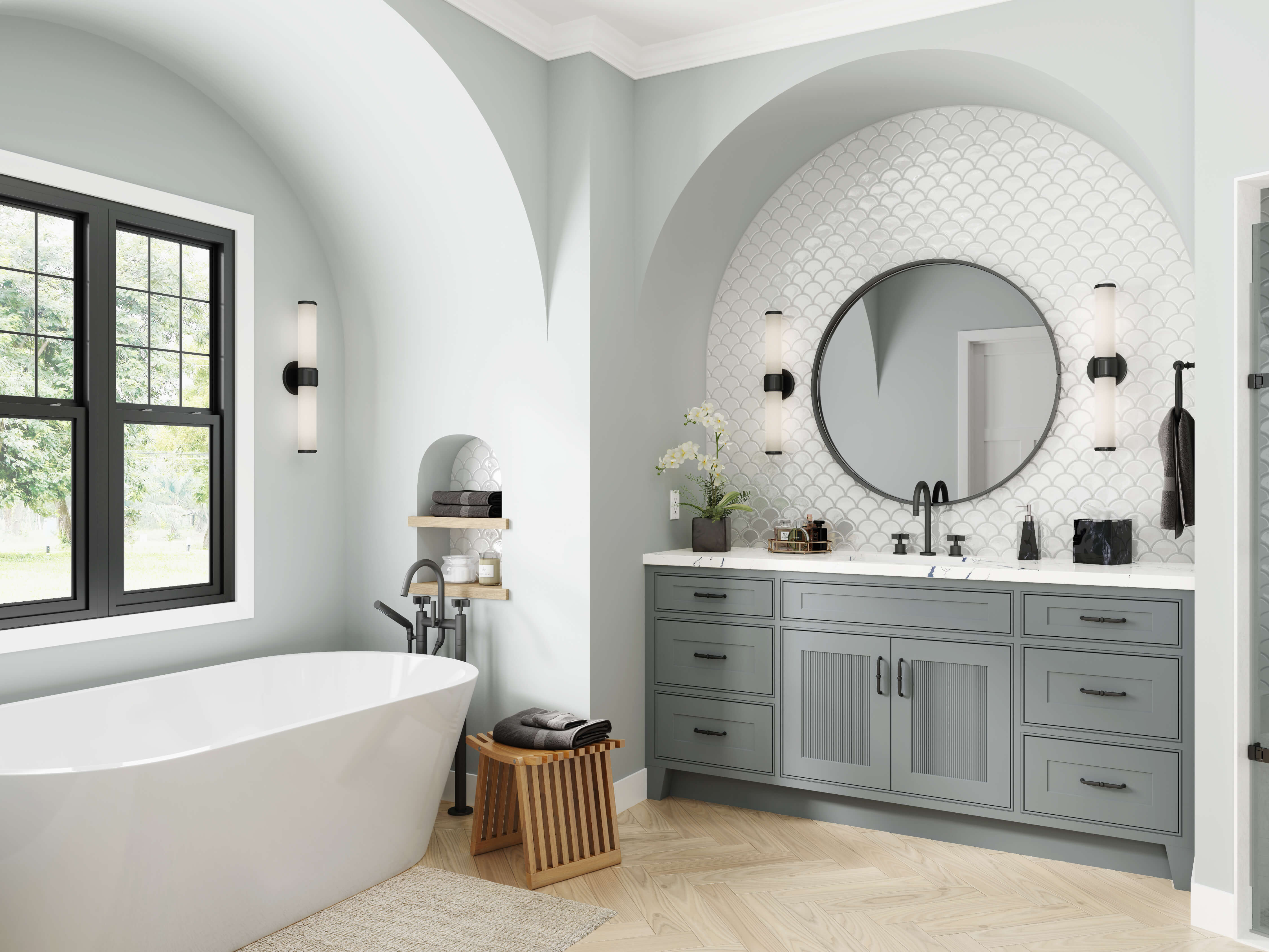 The below primary bathroom features arched alcoves that contain the vanities and free-standing tub. The cabinetry showcases our Parker Beaded Inset door in Software paint, with reeded center panels on the doors for added texture.