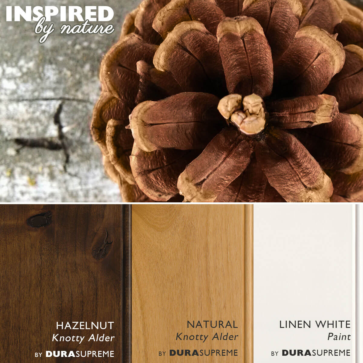 The sight of a charming pine cone inspires a heartwarming color palette. This cozy color palette combines Dura Supreme’s Natural Knotty Alder, Hazelnut stain on Knotty Alder, and Linen White paint. It reminds me of Christmas trees, ornate holiday wreaths, and all the joyous family gatherings that happen around them.