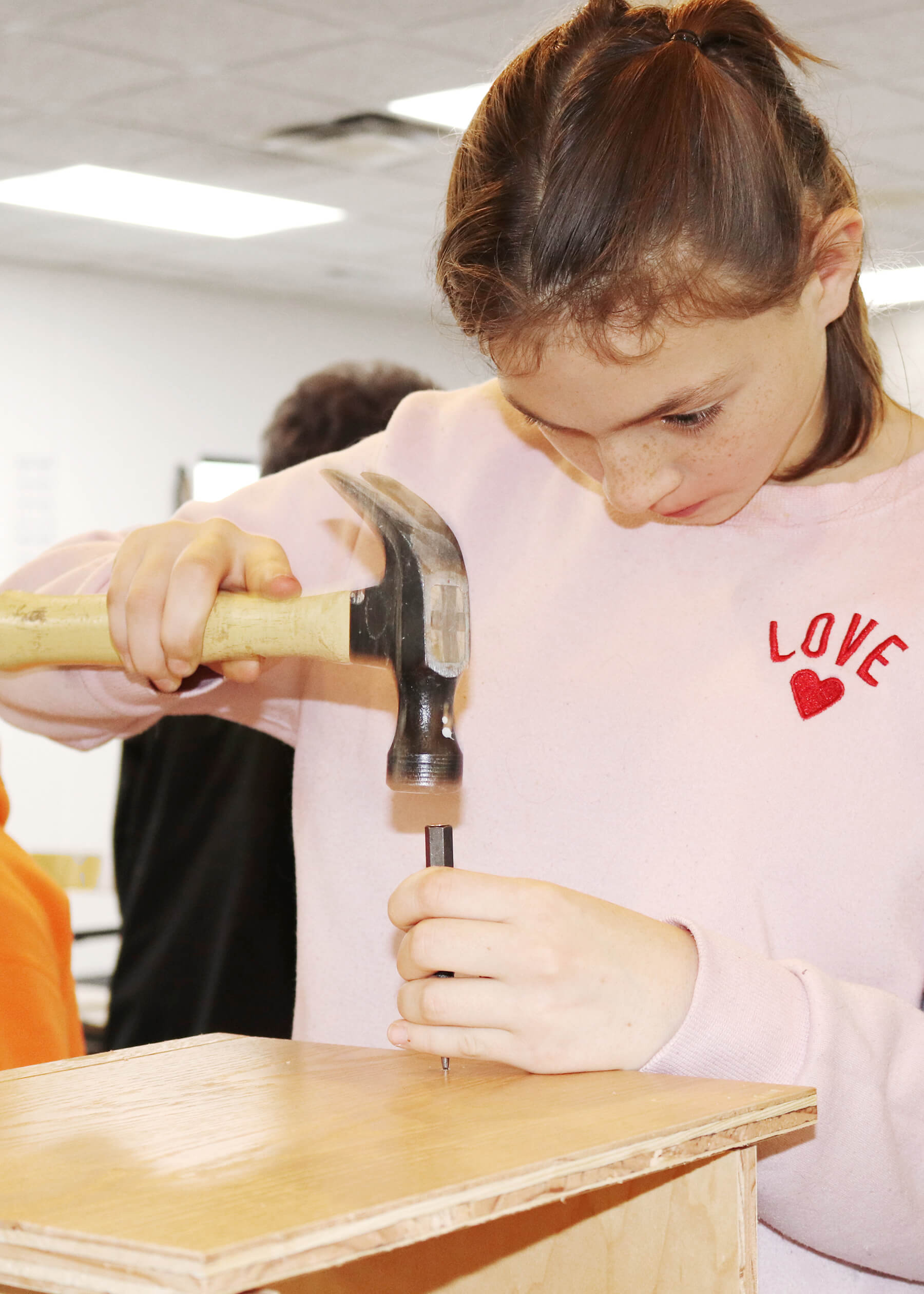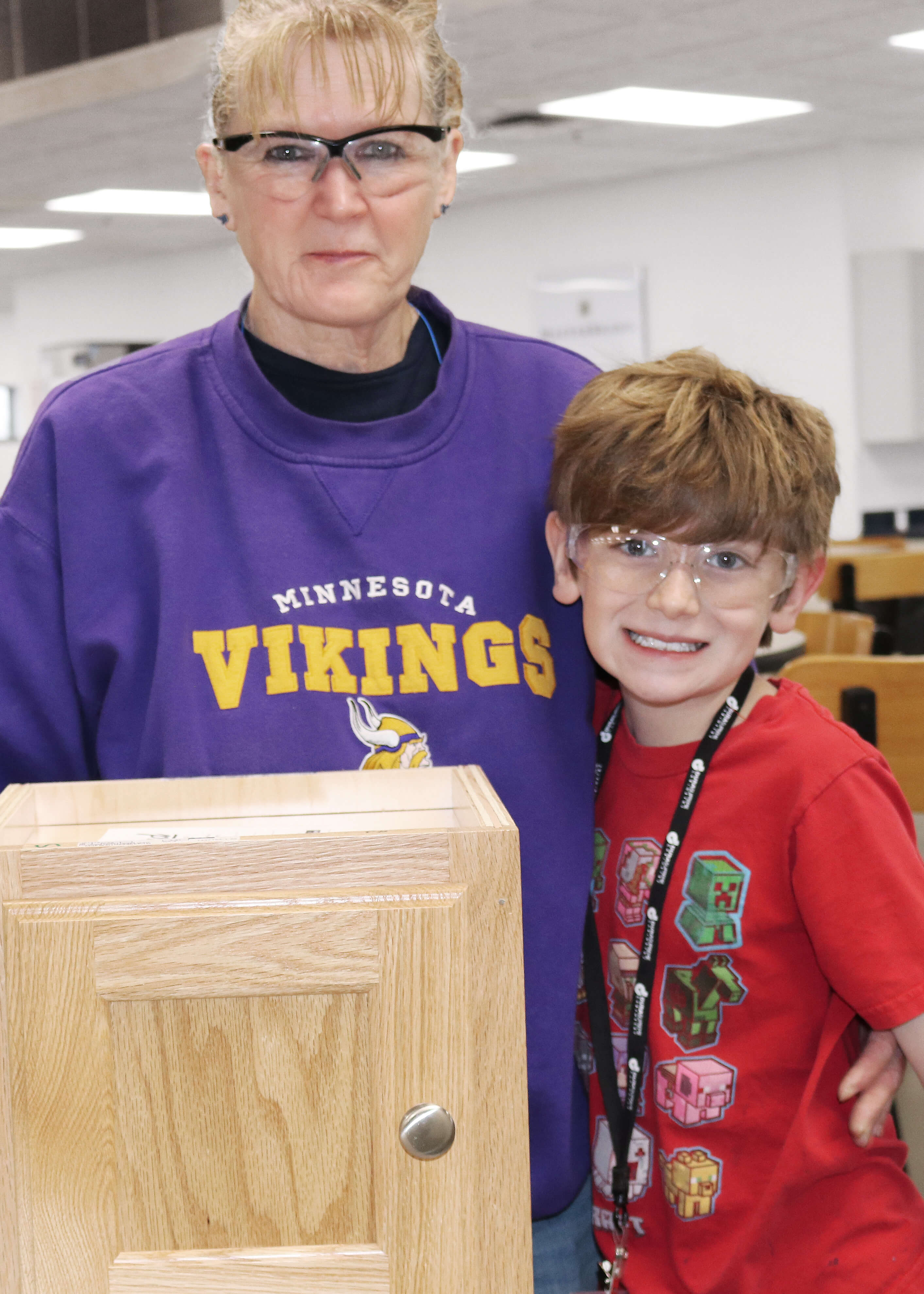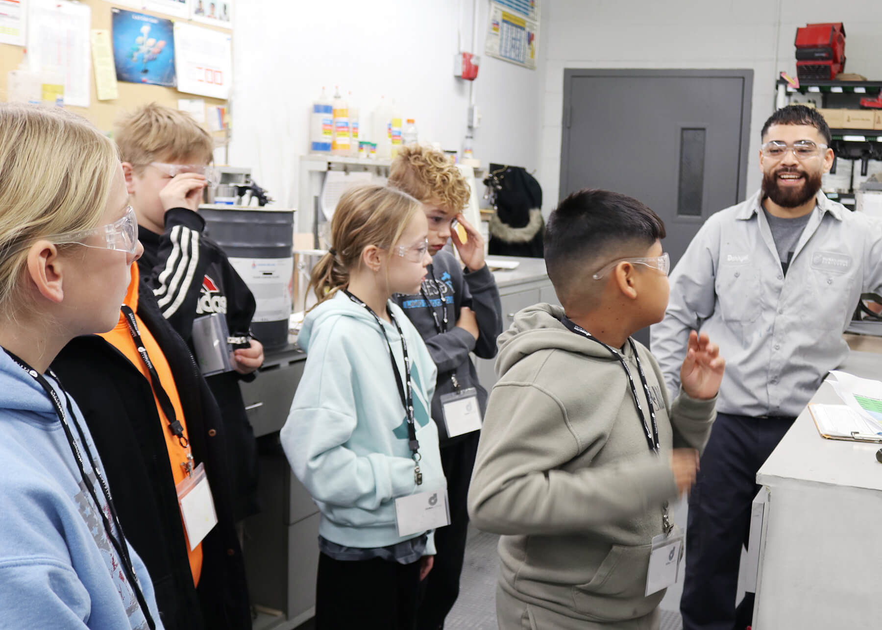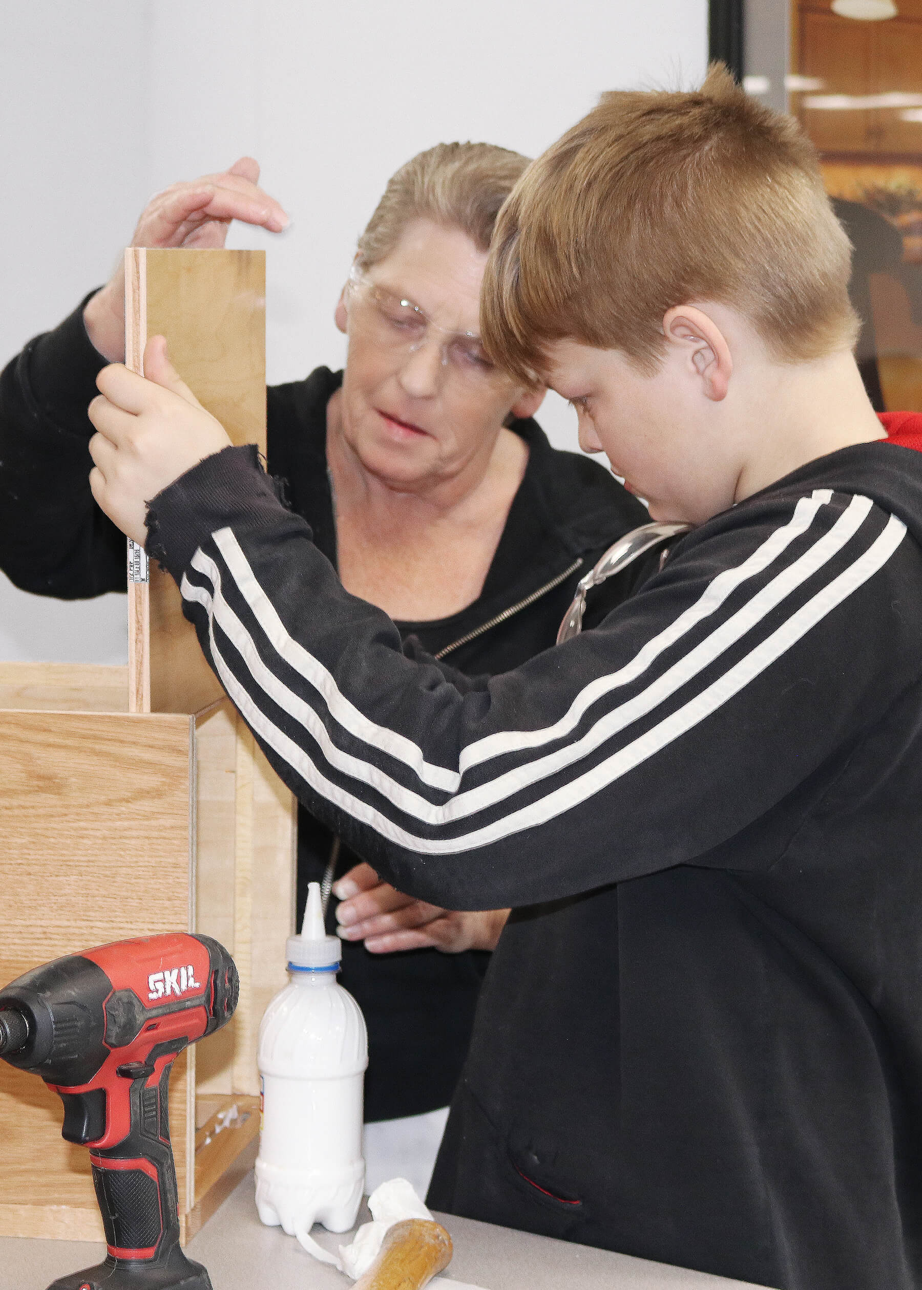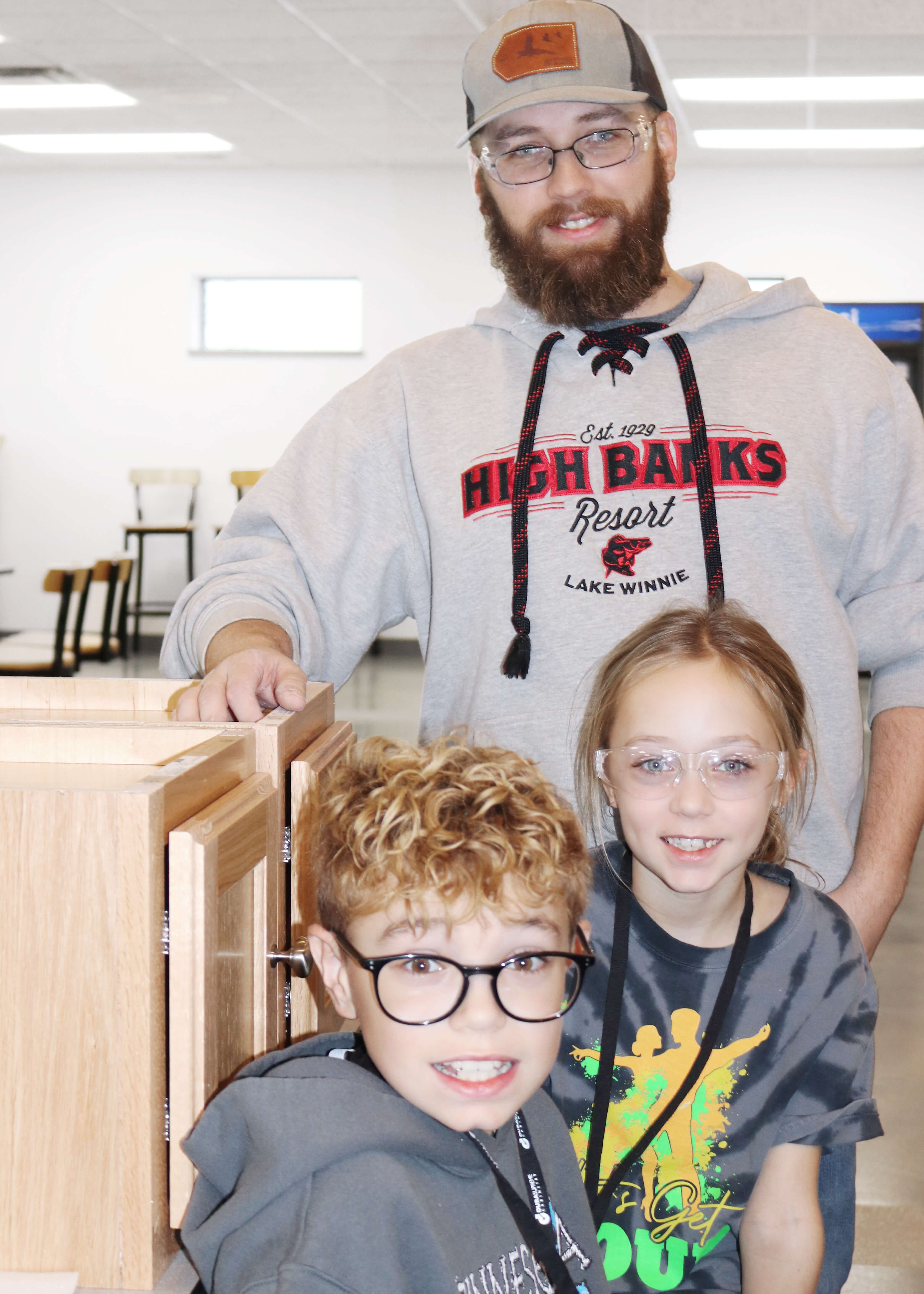 After the tour, the class meets in the lunch room for our Build-A-Cabinet project! With assistance from the managers and our volunteer supervisors as they get geared up with the proper safety equipment, our Environmental Health and Safety Manager, Tom Christensen, gives a presentation on safety and demonstrate the how to properly and responsibly use the tools they will need to make their cabinet. Then everyone dives into this fun hands-on activity.