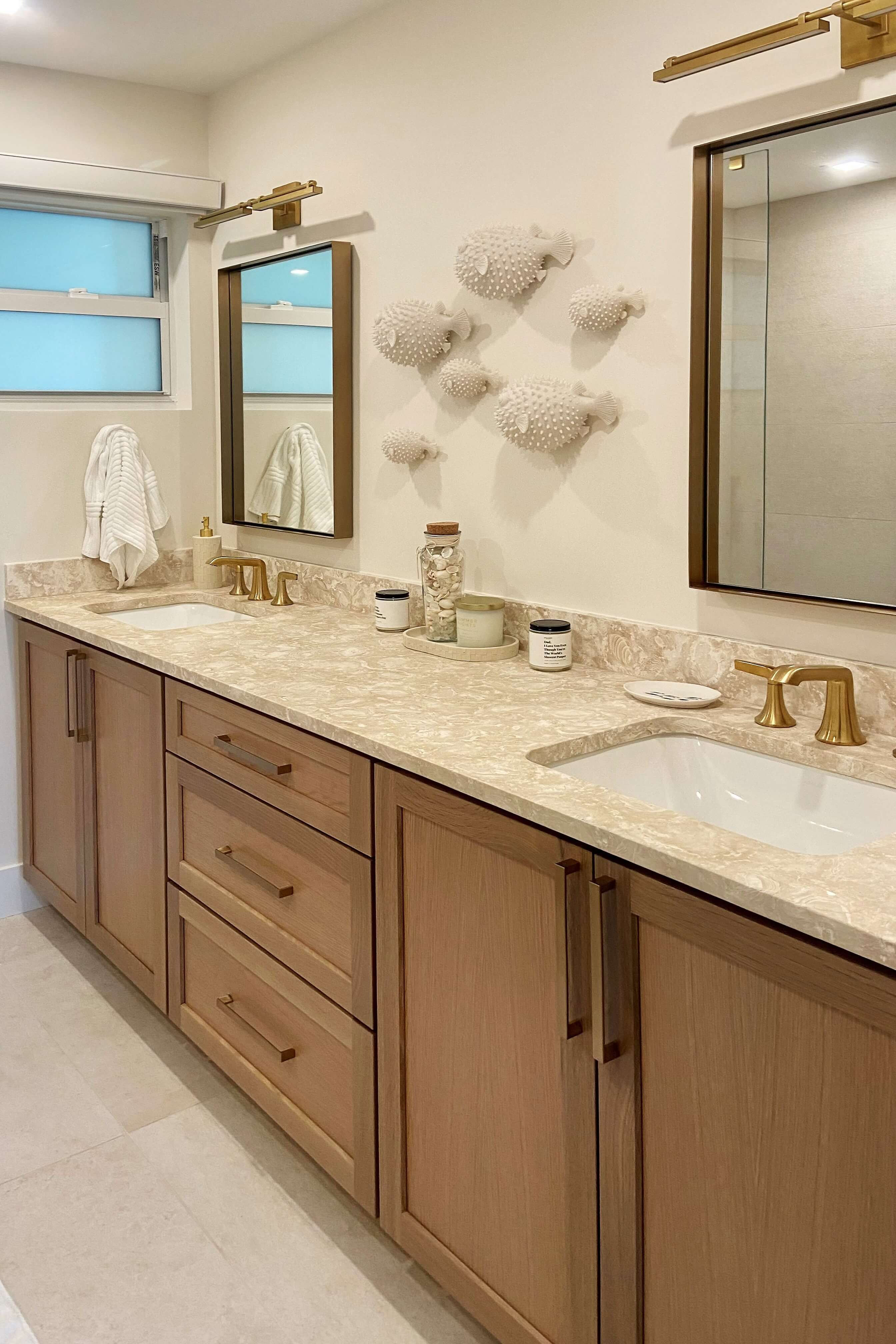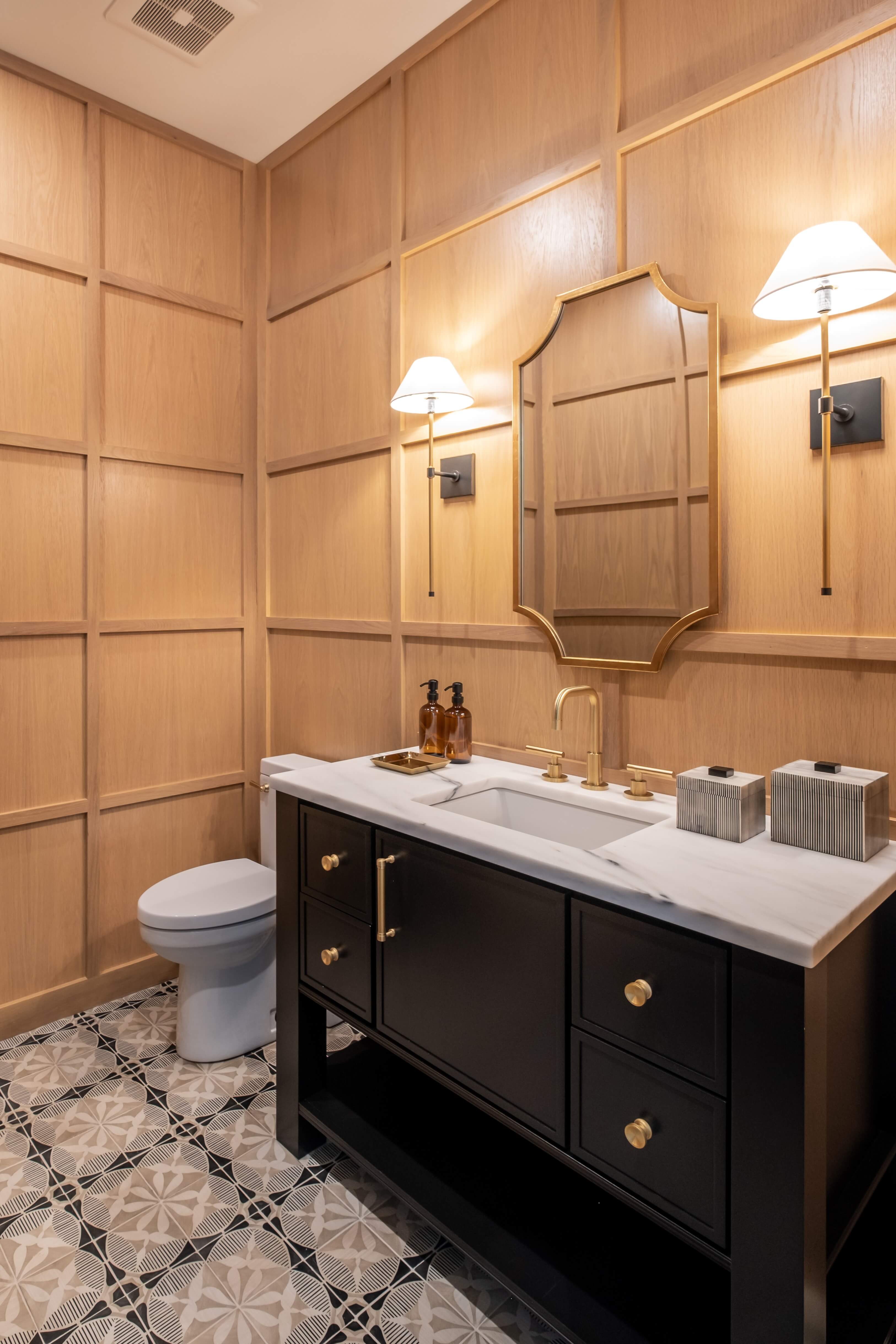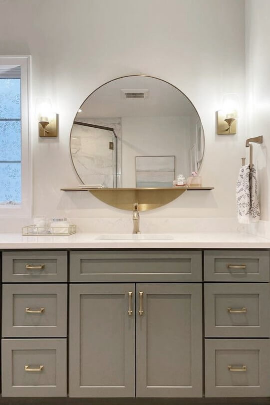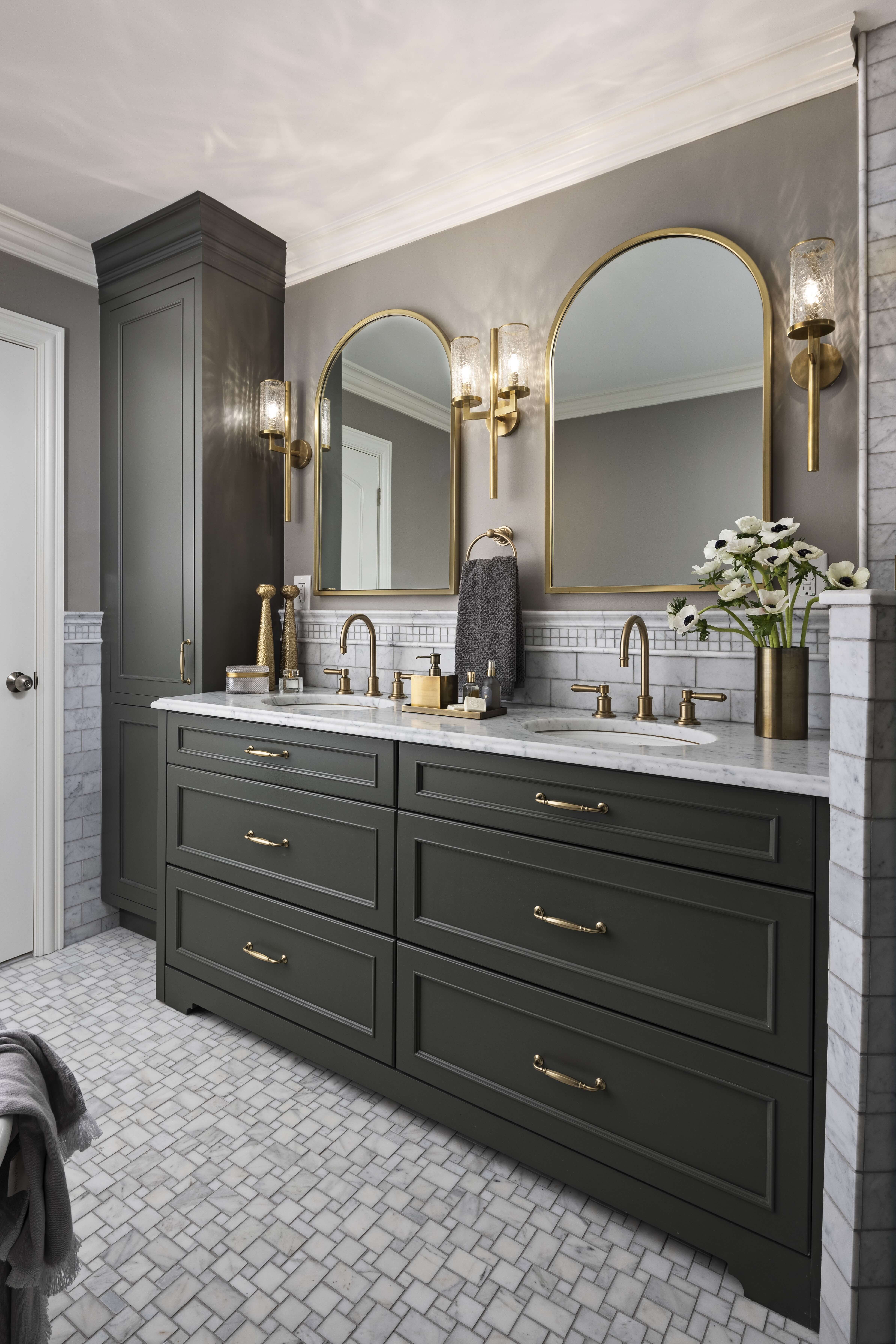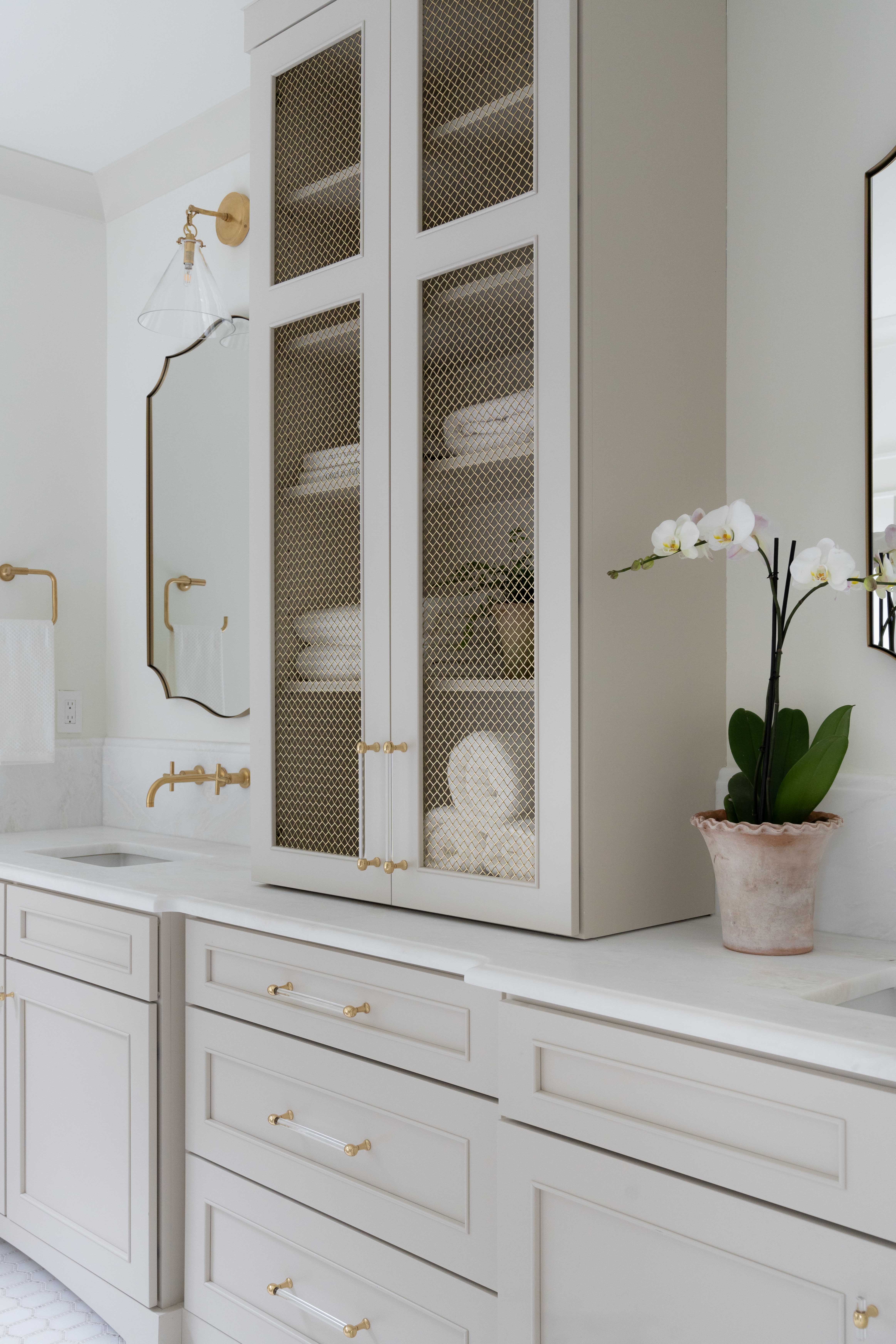 Below are several bathroom projects where gold accents have been used throughout, from hardware to fixtures and even wire mesh inserts, the gold accents elevate each room and add a level of sophistication. They also showcase using gold with traditional, transitional, and contemporary designs.