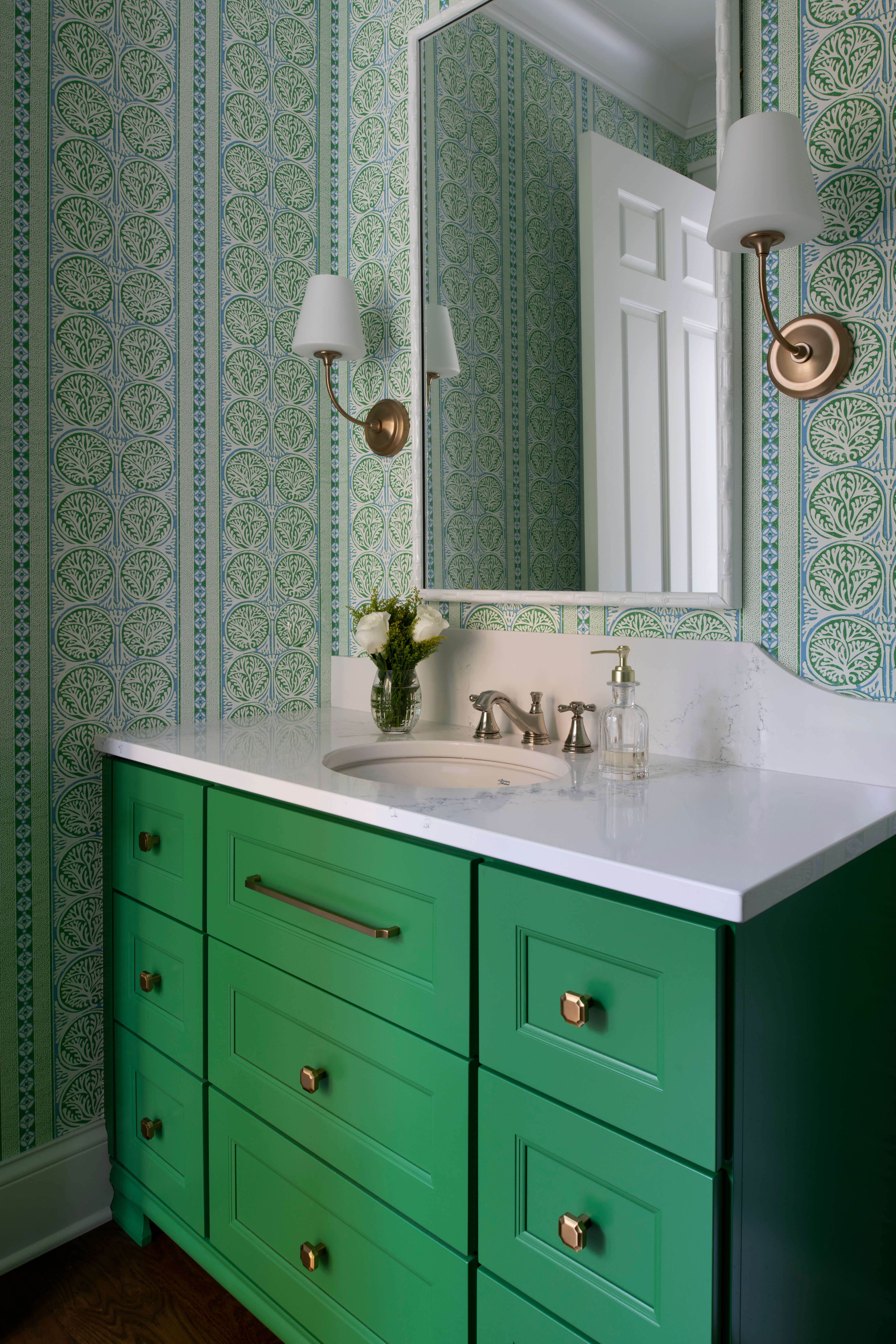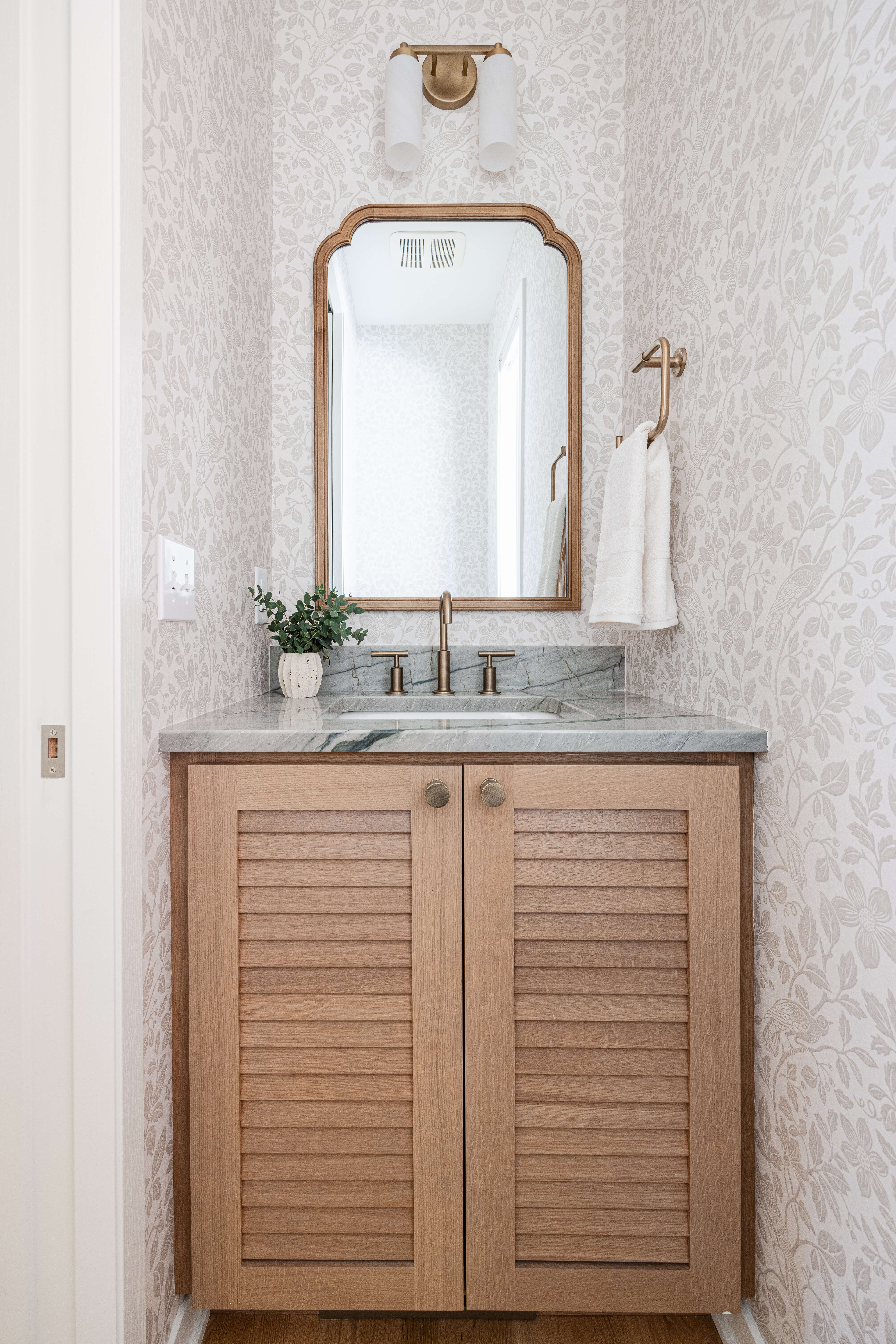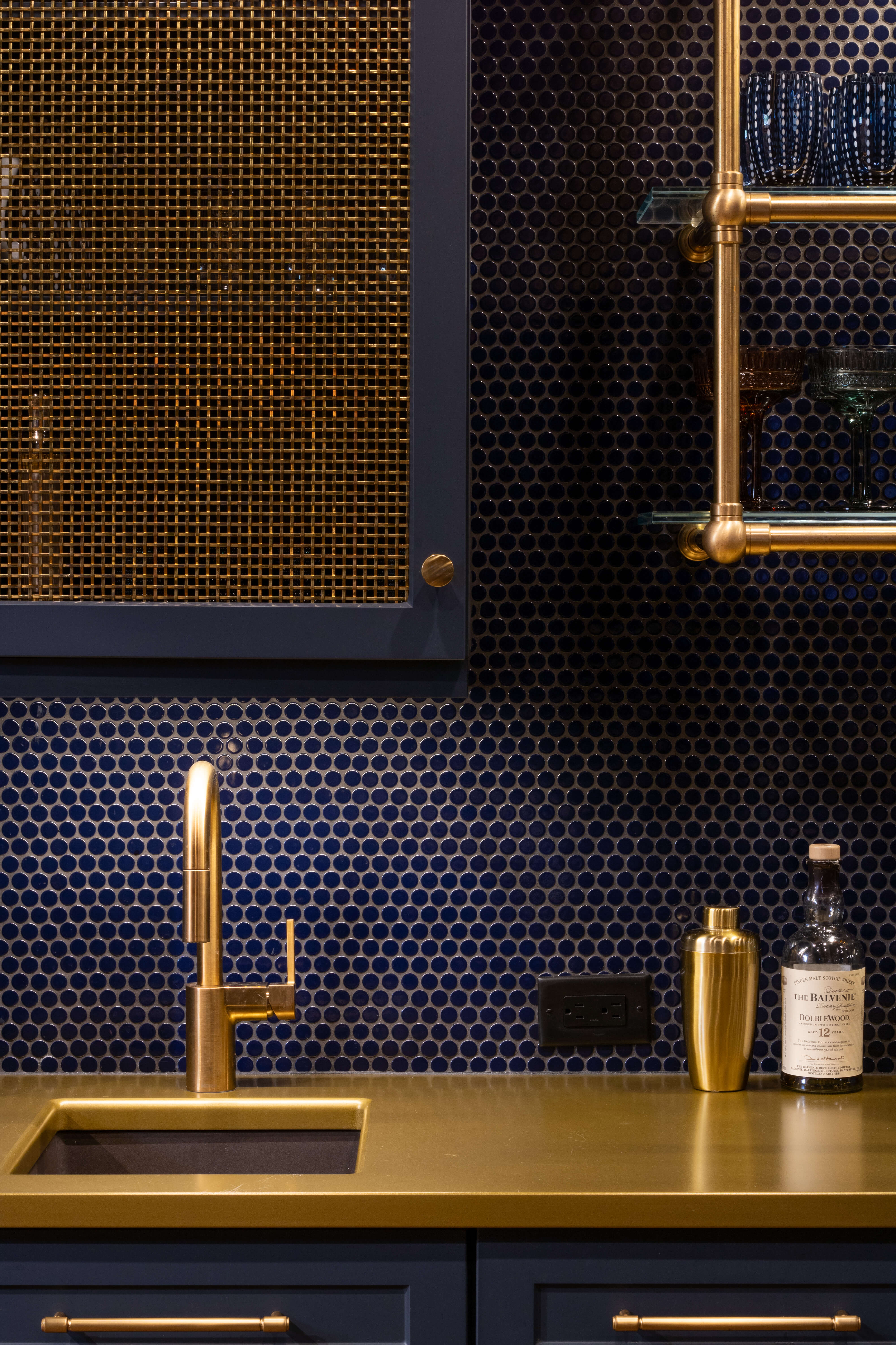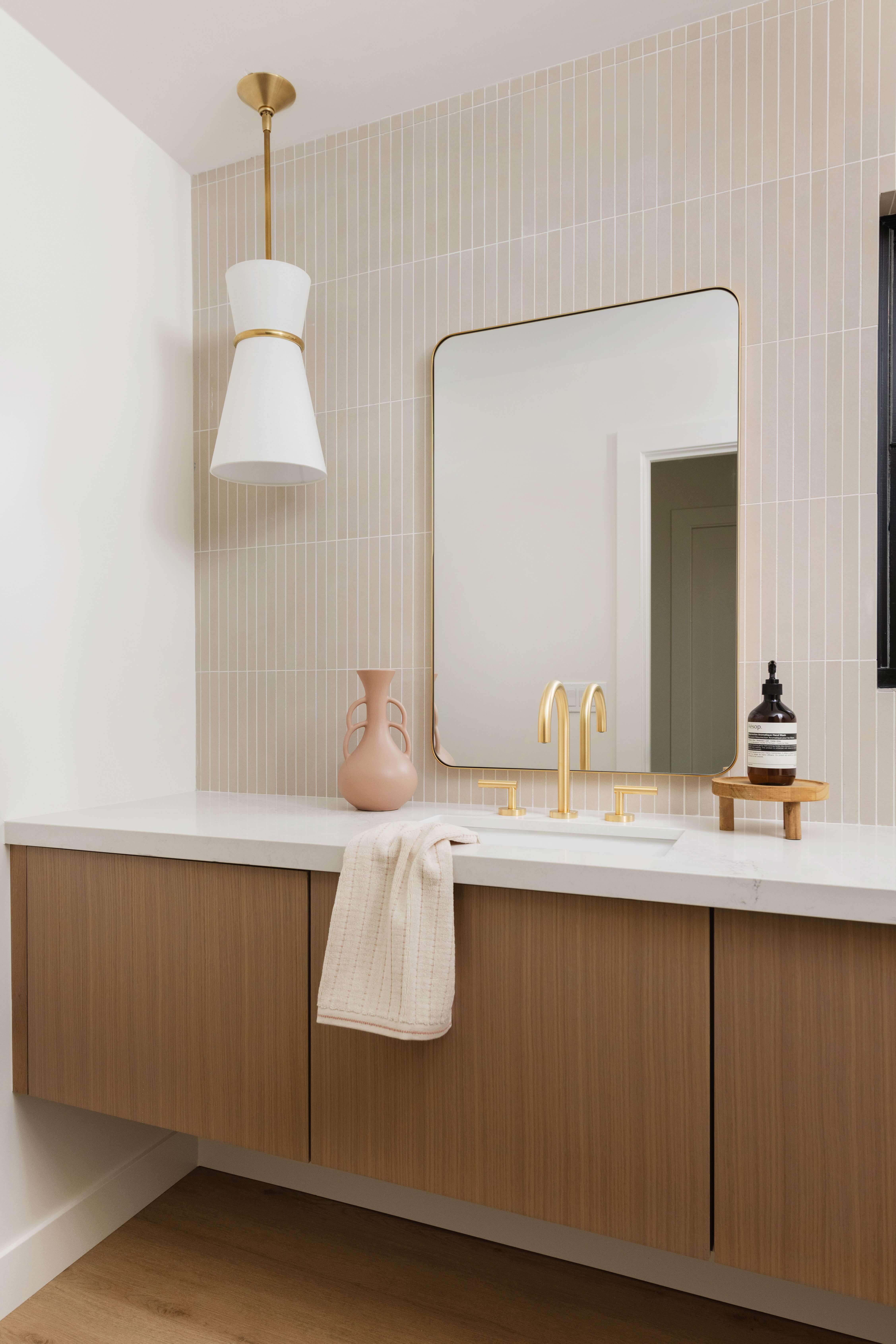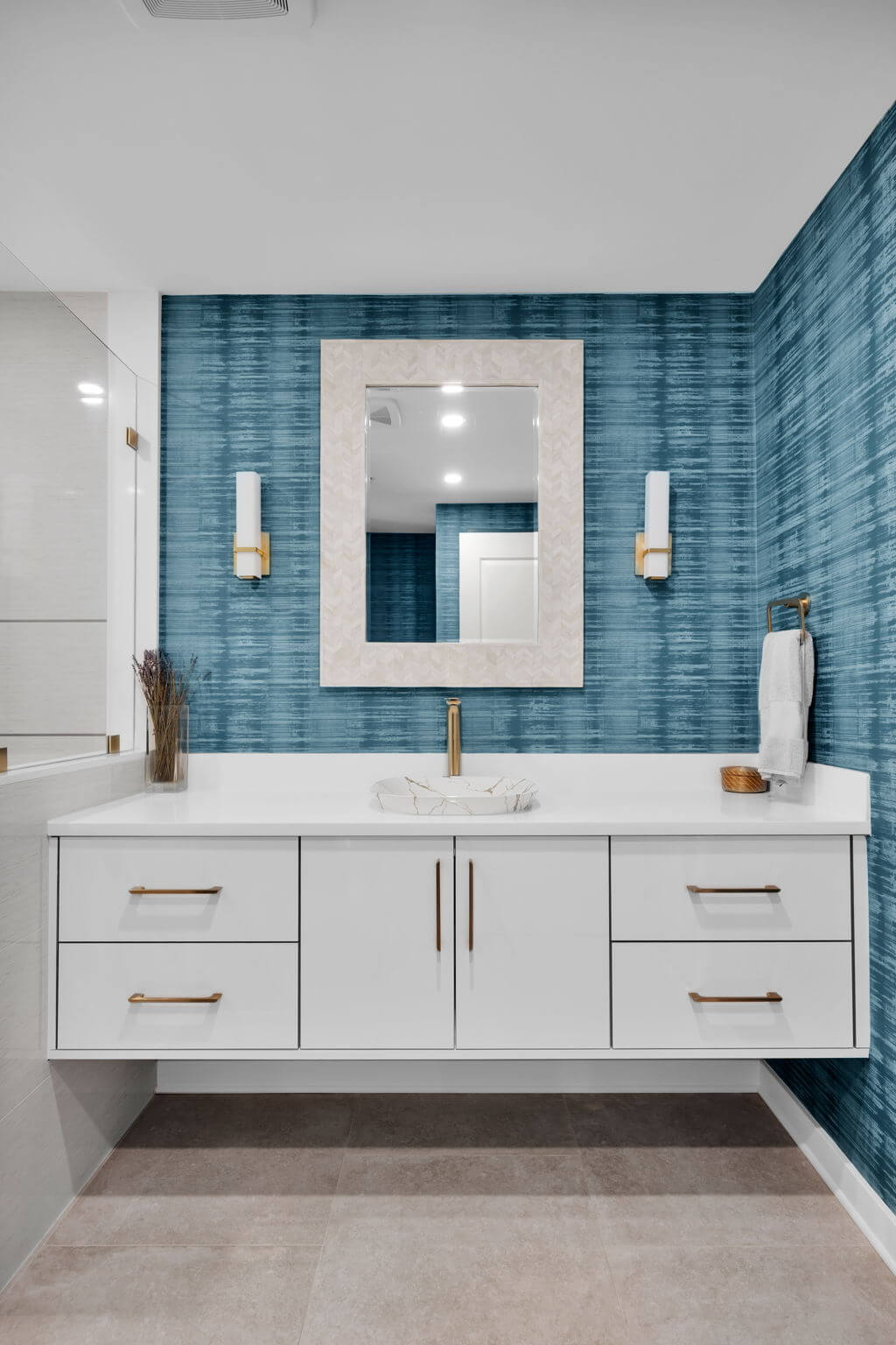 Below are several bathroom projects where gold accents have been used throughout, from hardware to fixtures and even wire mesh inserts, the gold accents elevate each room and add a level of sophistication. They also showcase using gold with traditional, transitional, and contemporary designs.