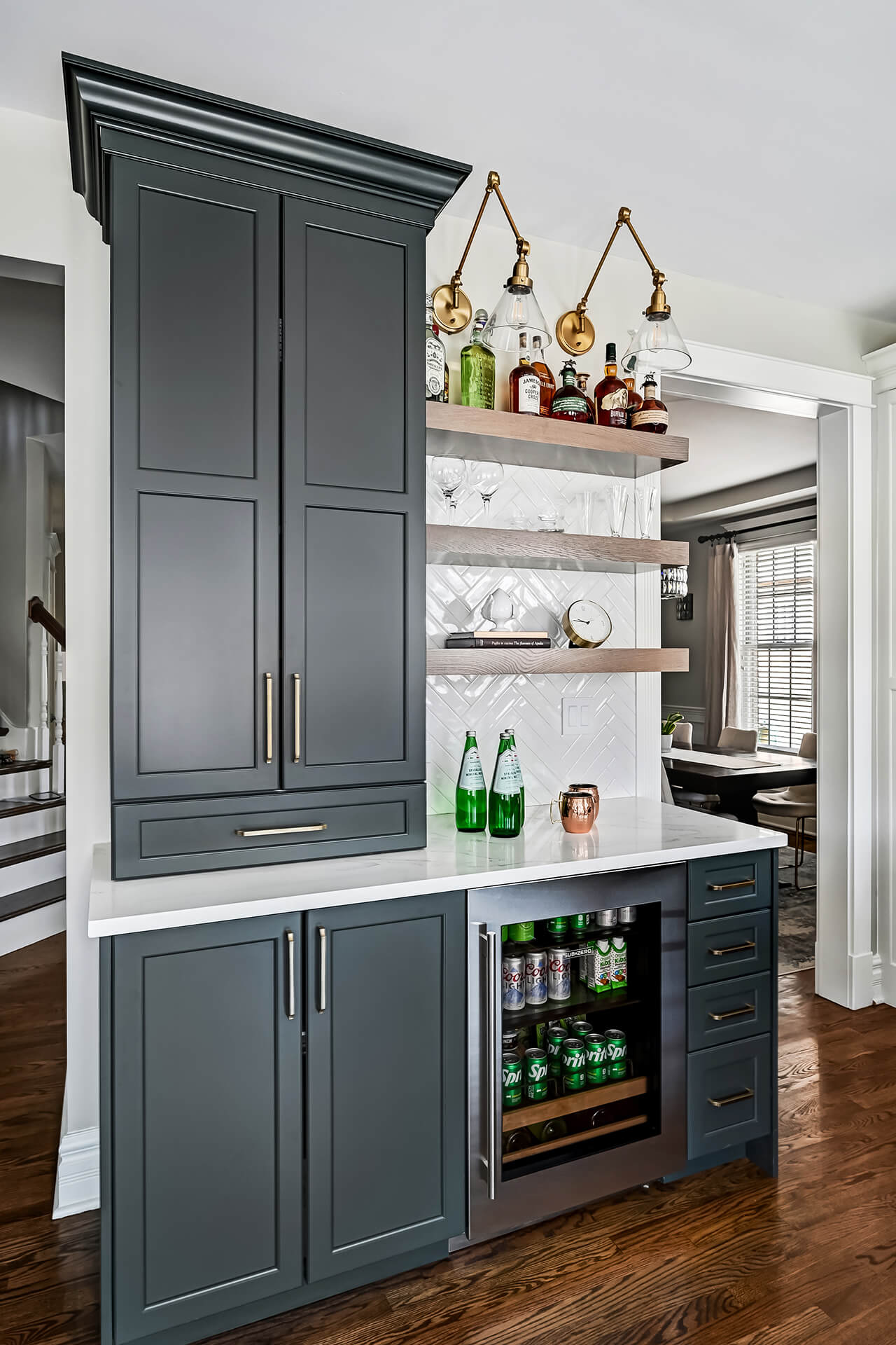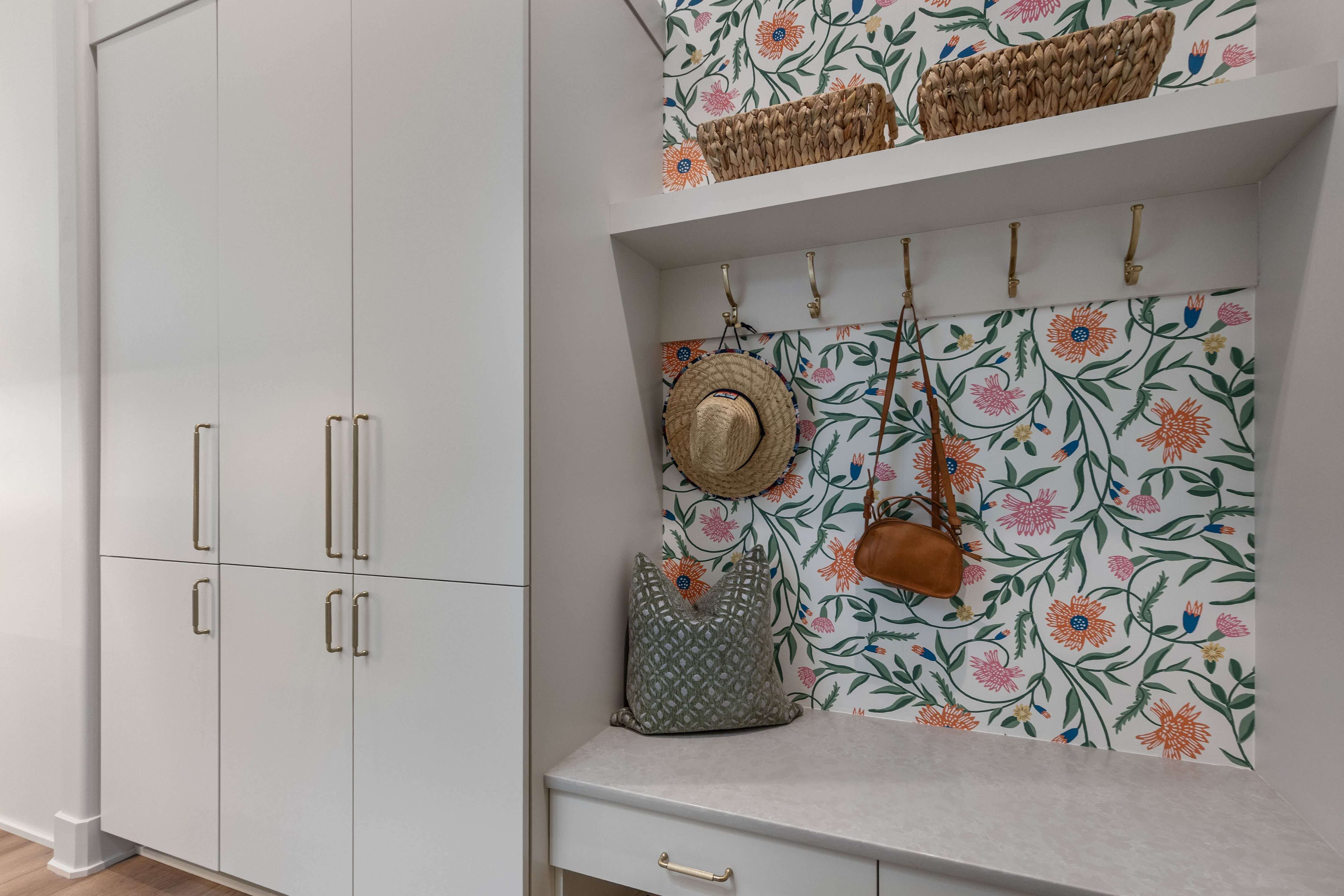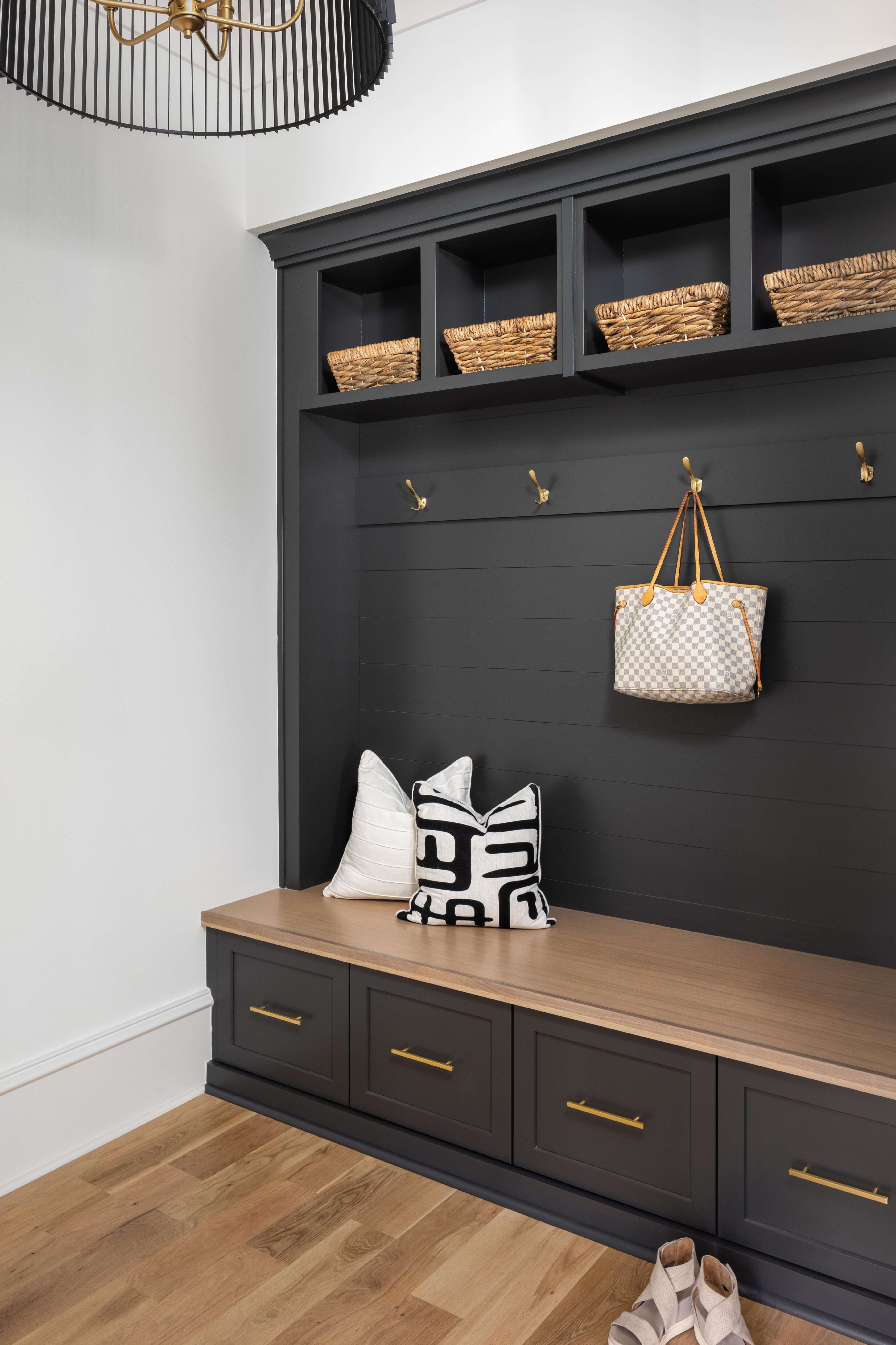 The project below combines both traditional and contemporary styles in one home. Both spaces use gold hardware on the cabinets, however, each space is unique; from the cozy corner banquet with gold-tone scones, to the bright and cheery entry with gold coat hooks. Both spaces feel more elevated with the warm, gold accents.