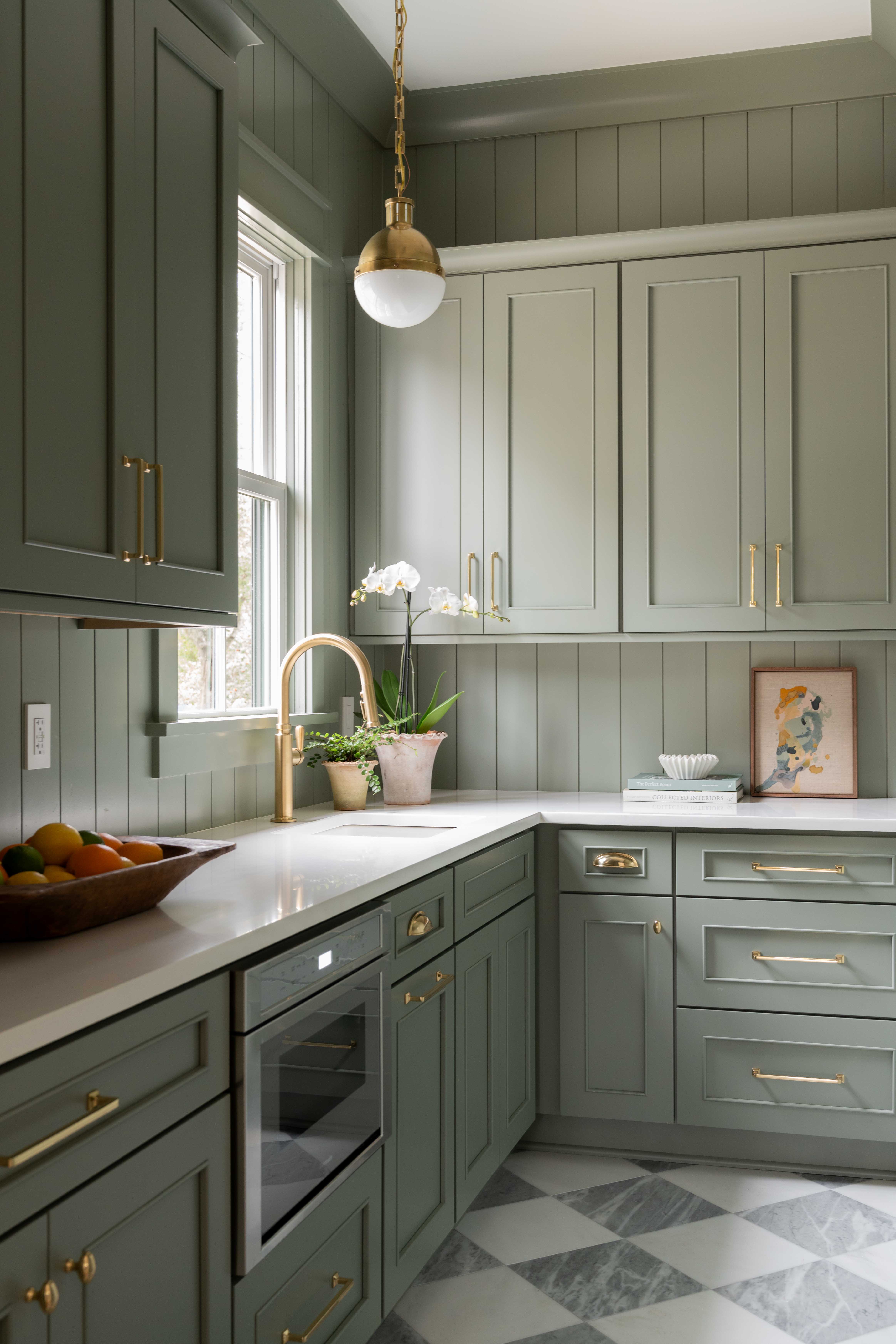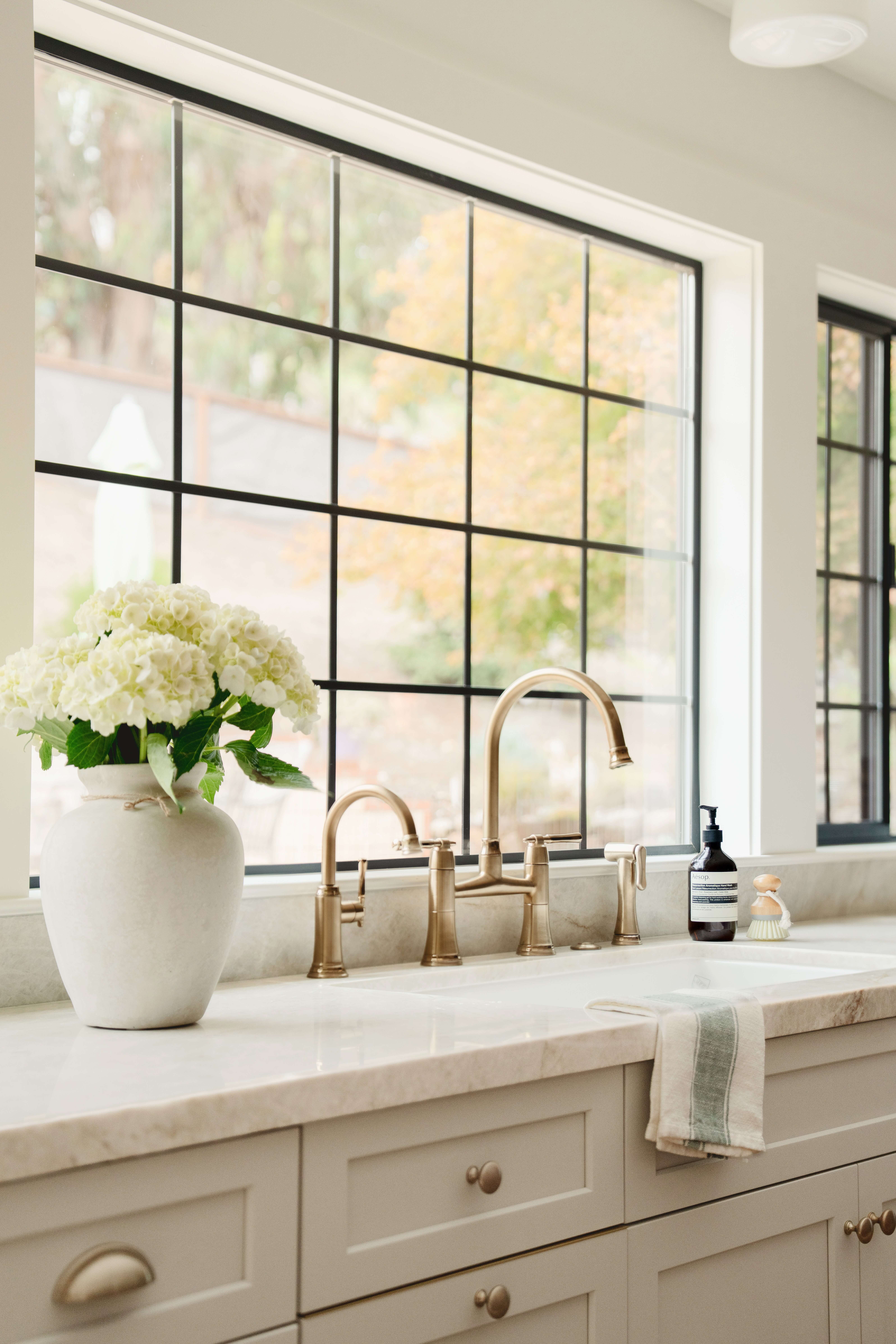 Satin Gold accents work well with the warmth of the off-white painted cabinets.