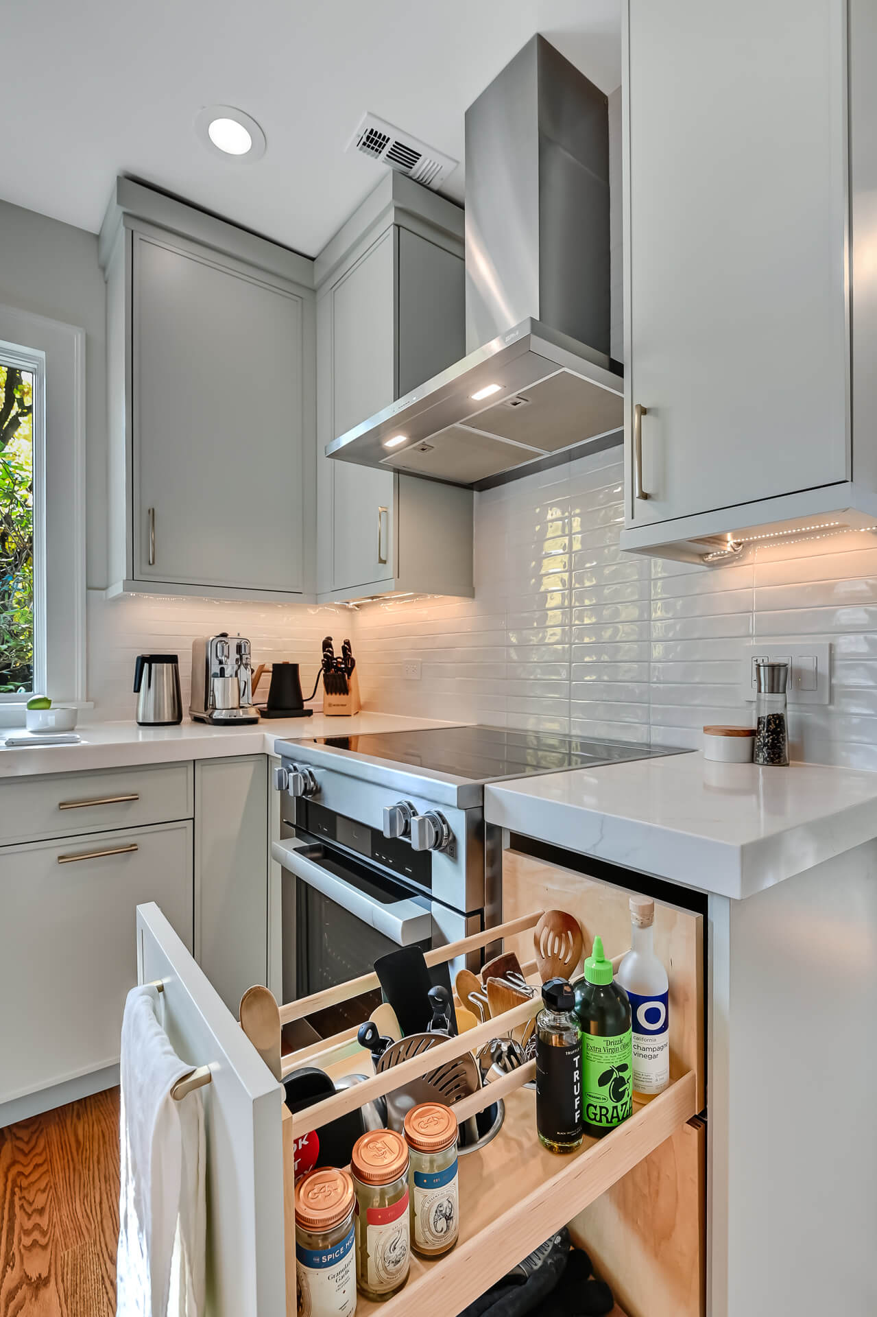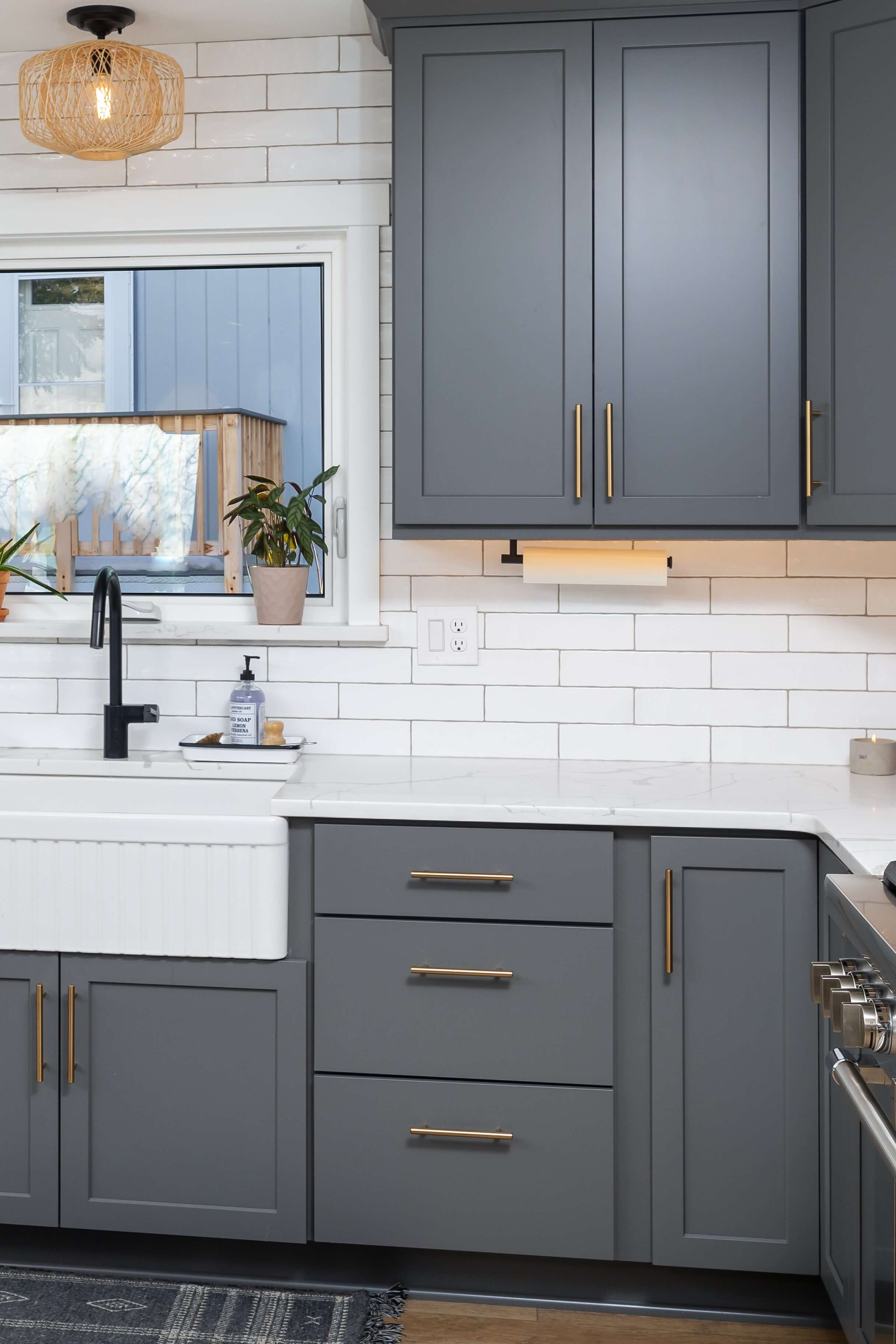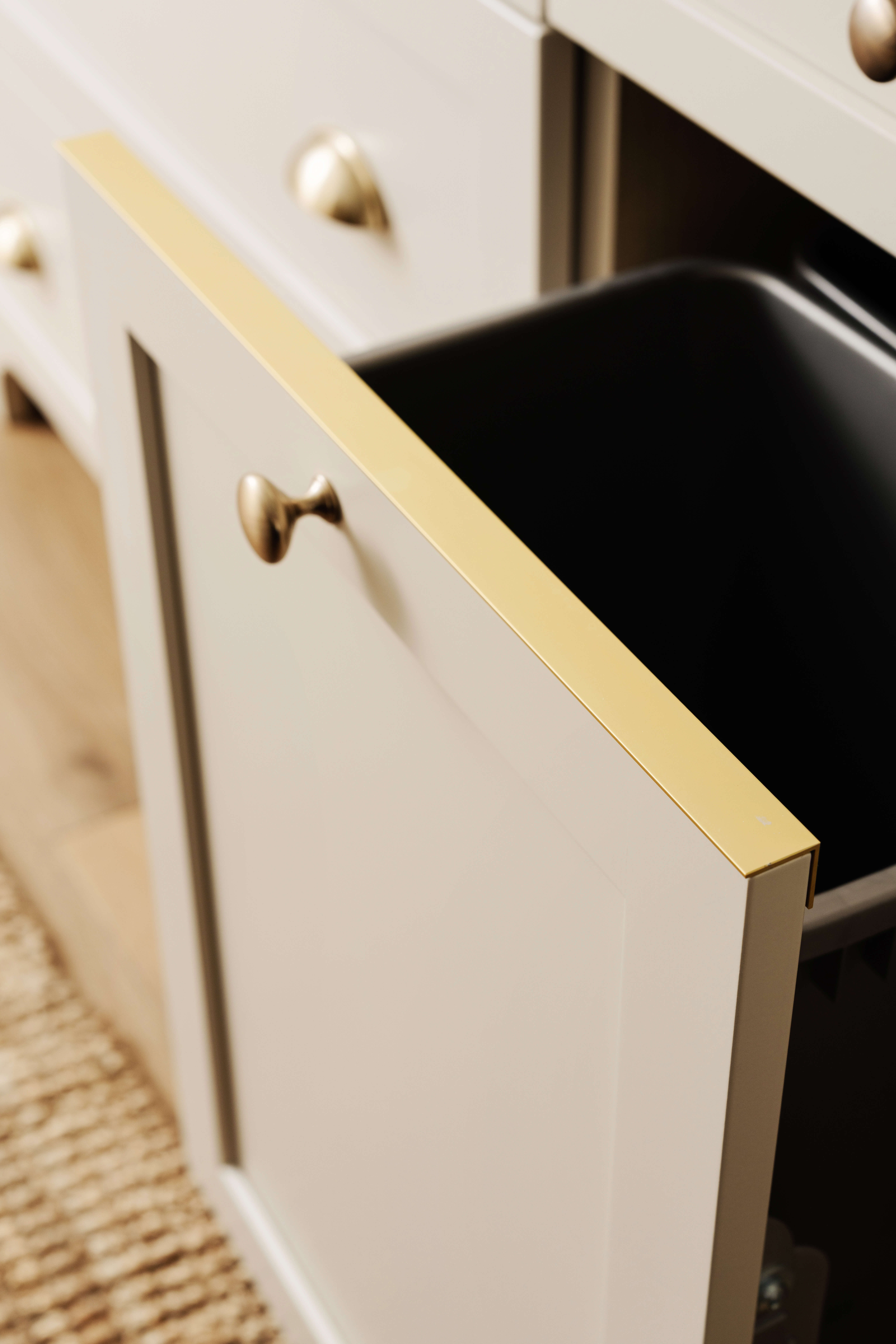 A satin gold Drip Edge to coordinate was added to the pull-out trash door.