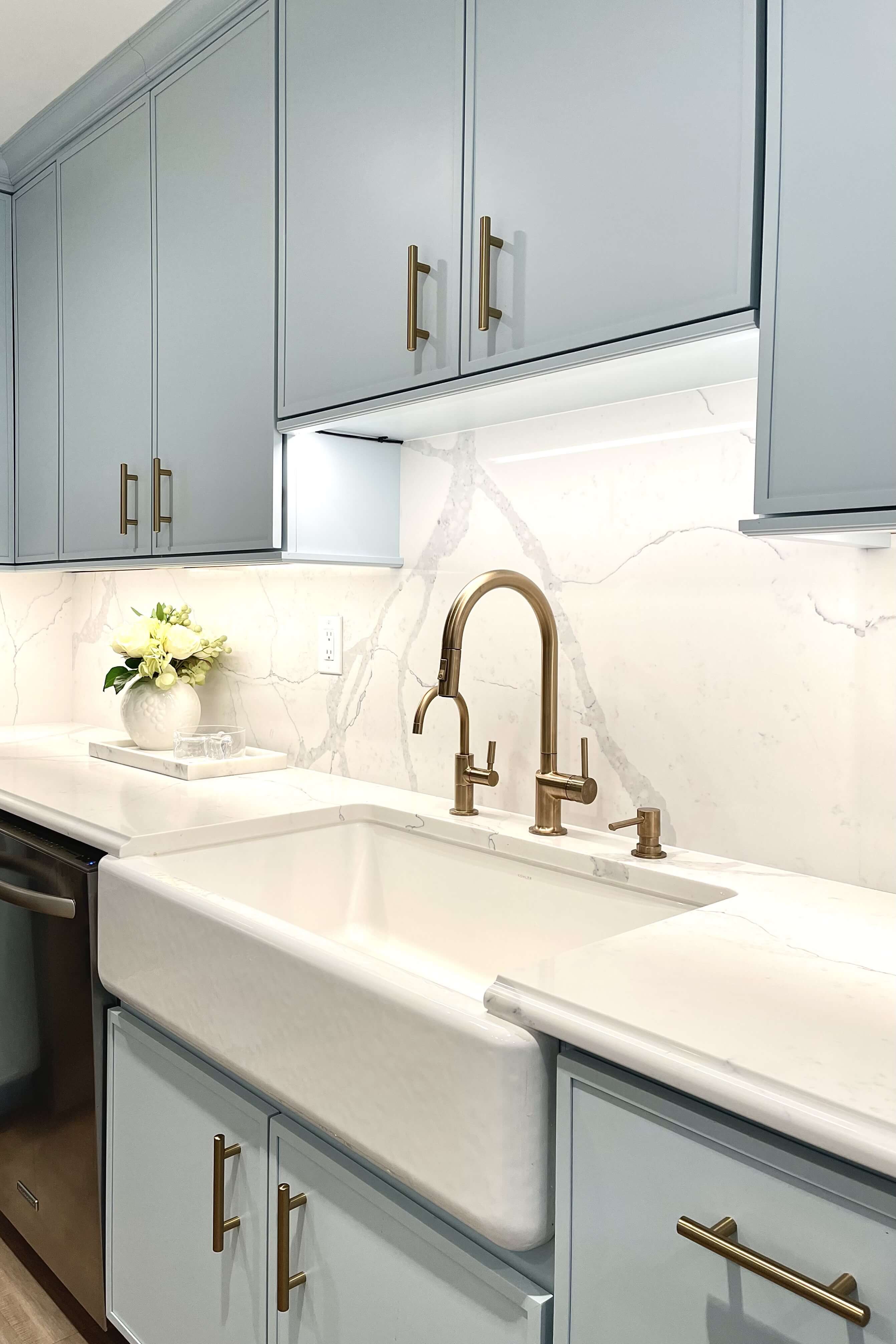 Remember the brass fixtures of the 1980’s that were prevalent in design? That look didn’t age well and fell out of grace, being replaced with sleek chrome finishes. But not to worry, we are not regressing back to then! The gold finishes being used today have evolved, and the brassy tones have been replaced with true gold finishes in various tones; from brightly polished gold to warm honey or antique golds that bring an old-world look to a room. In today’s blog, we’re going to share some Dura Supreme Cabinetry projects that feature gold accents throughout the design, so grab a bowl of Lucky Charms and let’s take a look!