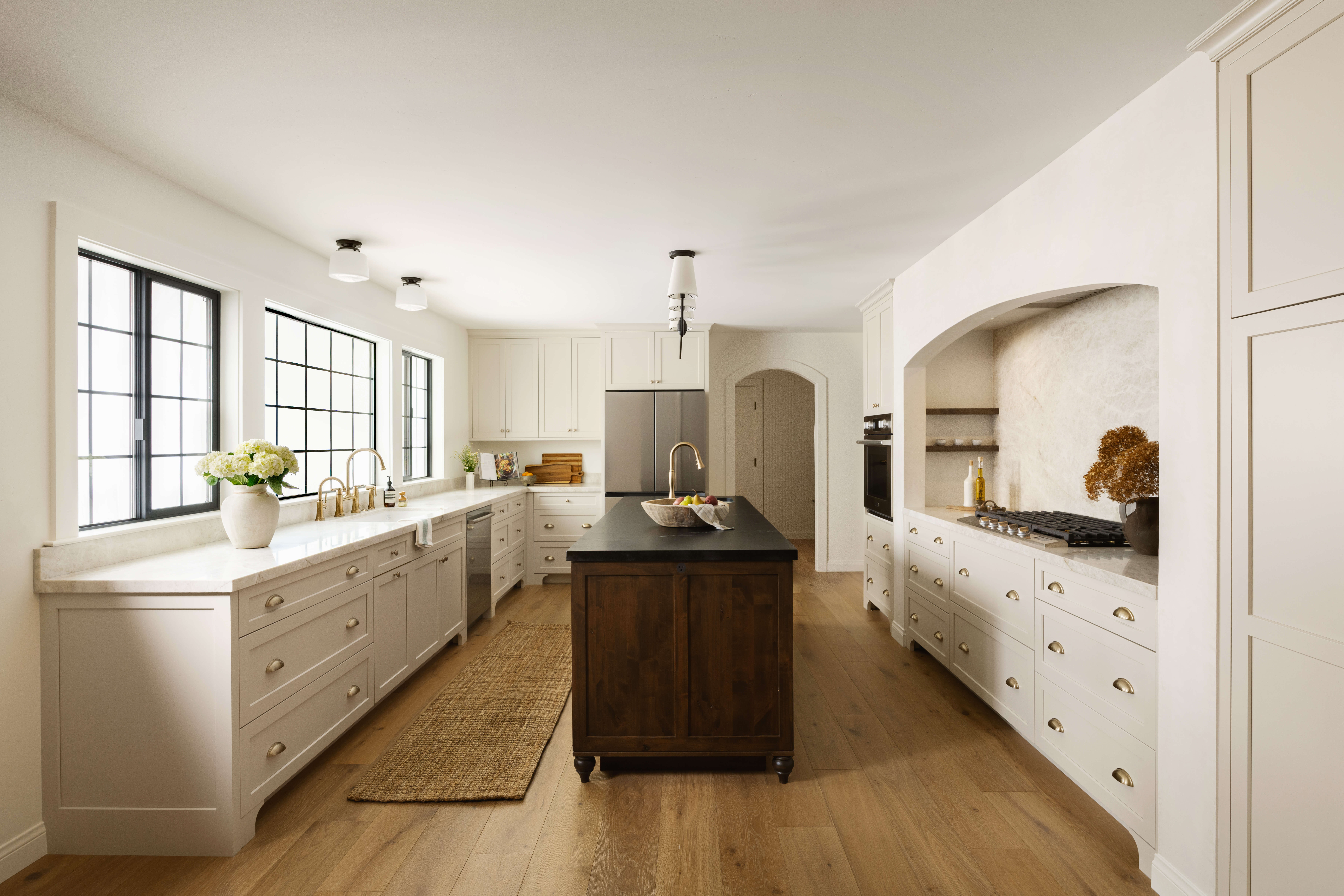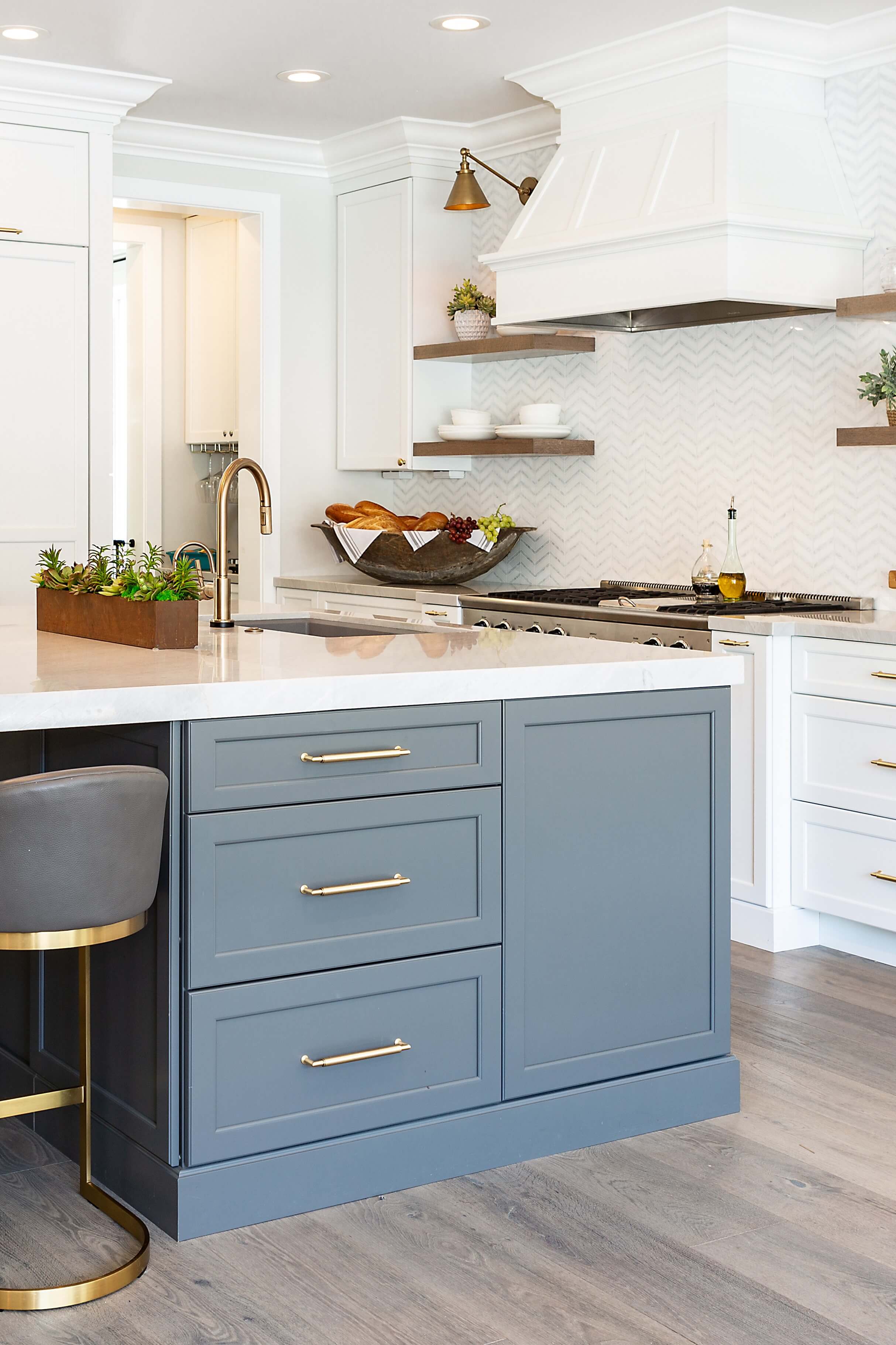 The project below is a beautiful example of a soft white kitchen that’s bright but not stark, and has warmth due to the stained cabinets and gold fixtures. The cabinetry paint has a warm tone and plays off the stain on the kitchen island. The gold hardware and fixtures add to the warmth of the room, softening the look and adding a level of richness, making it feel cozy and inviting.