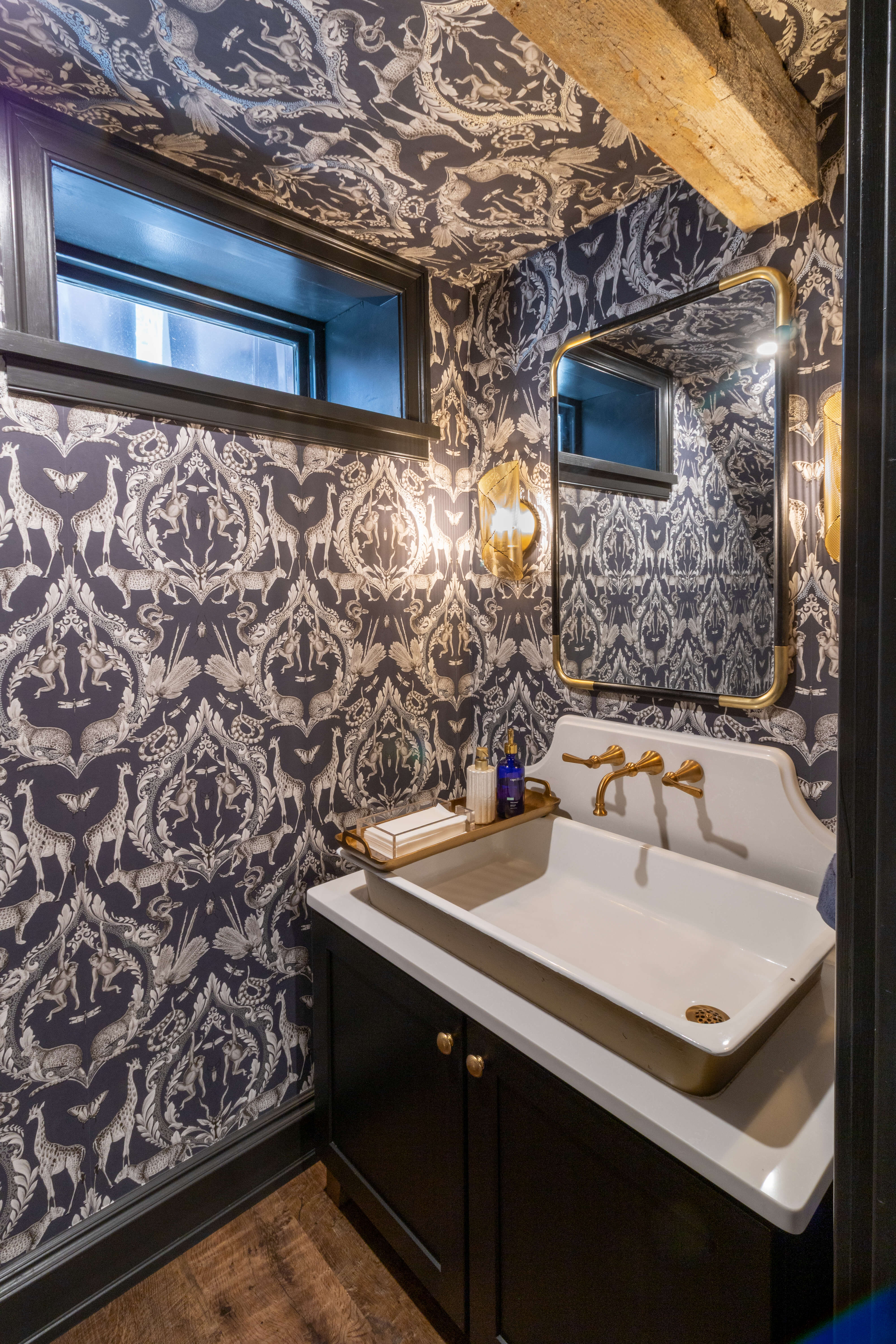 Below is a great example of how gold can be used with black to create elevated drama. This stunning primary bath is all sorts of moody, with the gold accents popping off the black painted cabinets featuring our Reese door. The gold used throughout softens the pallet and warms it up as well.