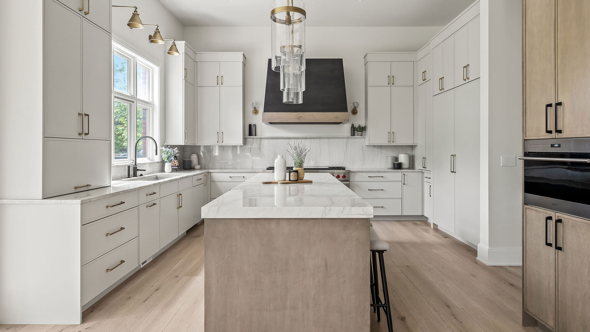 The lighting played a huge role in tying everything together, from pendants over the island to sconces above the sink and the hood.