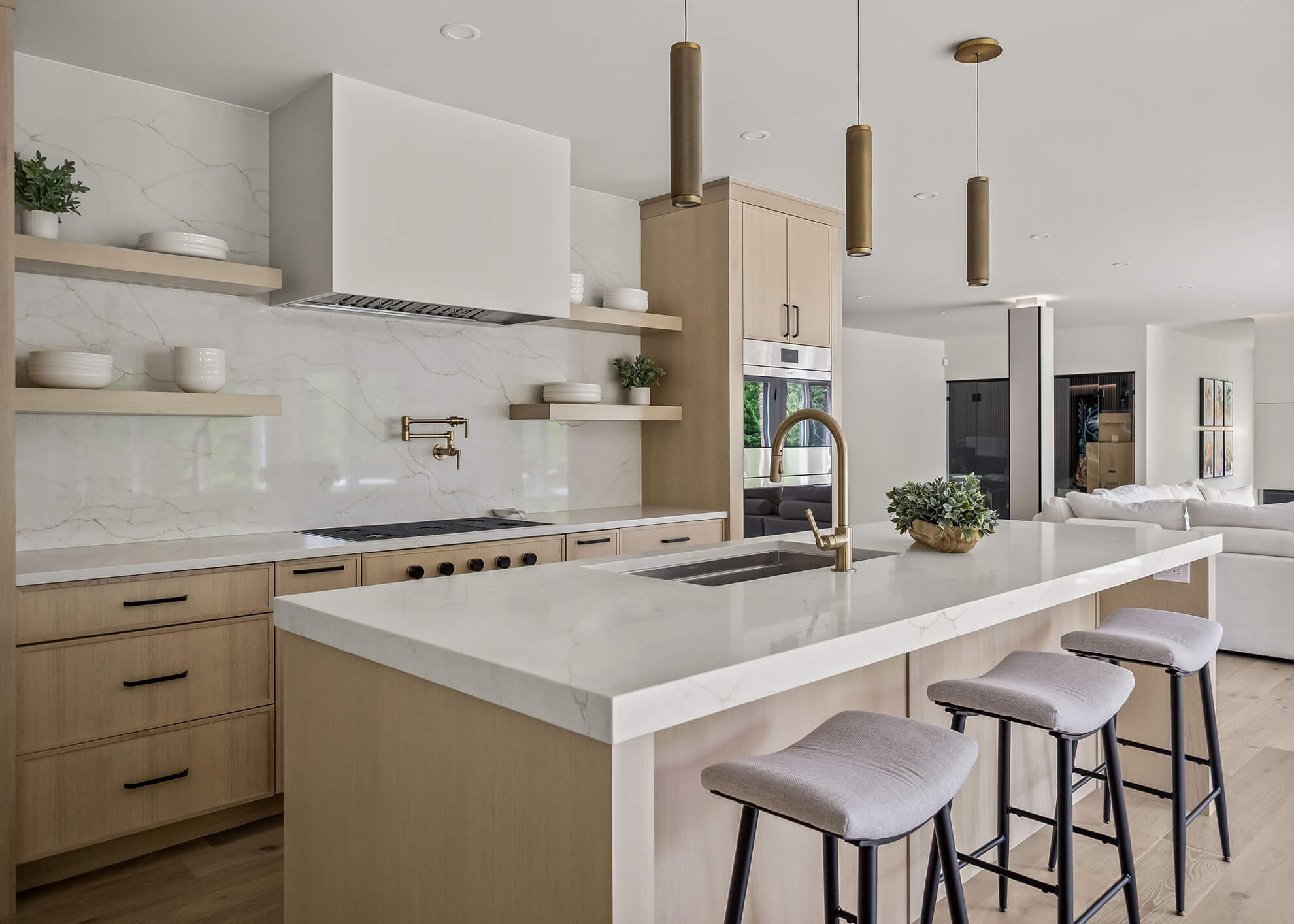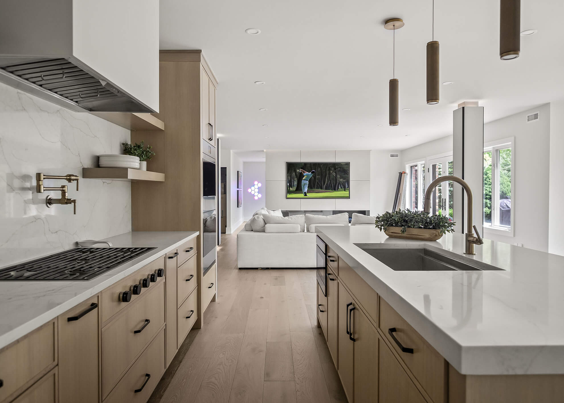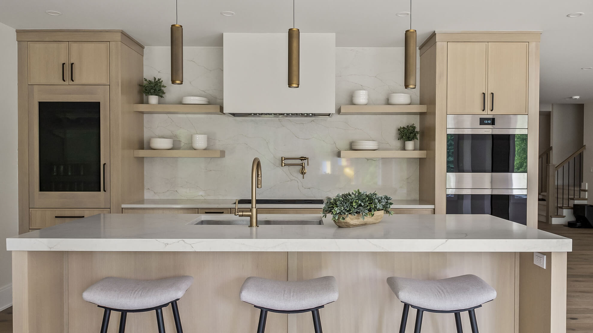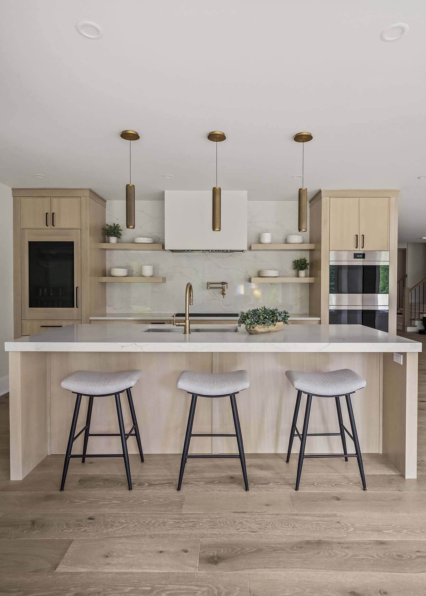 Just downstairs, we created a second kitchen designed for entertaining. With clean-lined Quarter-Sawn White Oak cabinetry, integrated appliances, and a palette that feels both modern and relaxed, it is the perfect place for guests to gather.