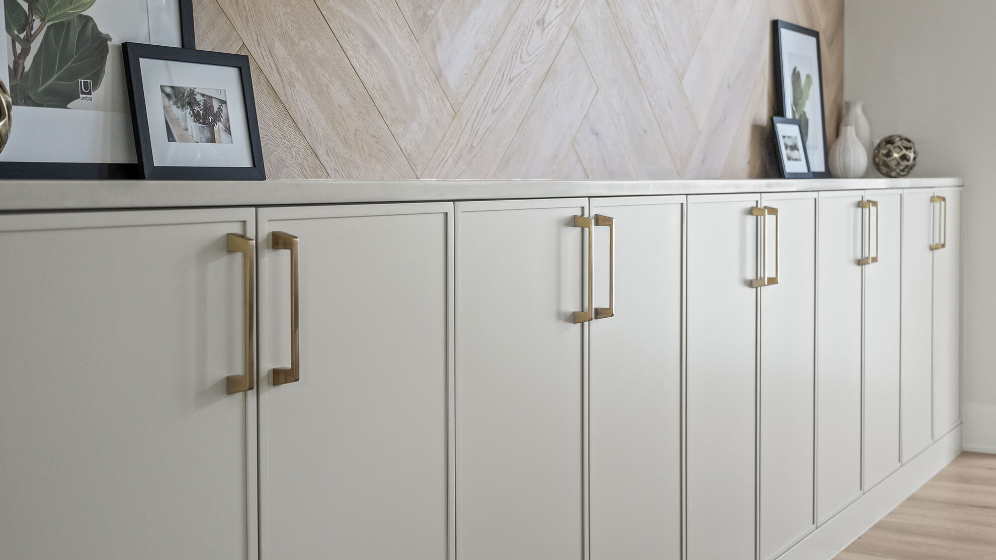 We chose the Reese door style in the “Canvas” paint, echoing the kitchen while complementing the light herringbone accent wall.