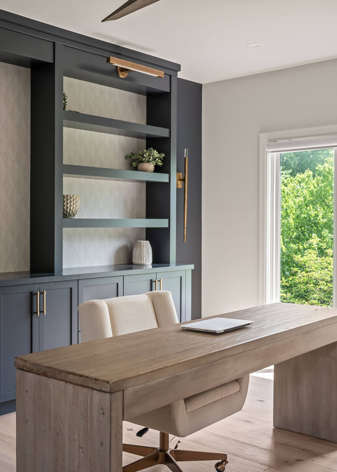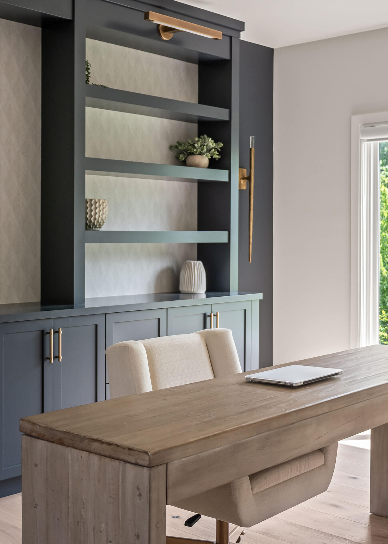 In the home office, we took a bolder approach – cabinetry using the Hudson door style in “Cyberspace” paint finish, bringing focus and sophistication to the space where work happens. It feels grounded, personal, and strong.