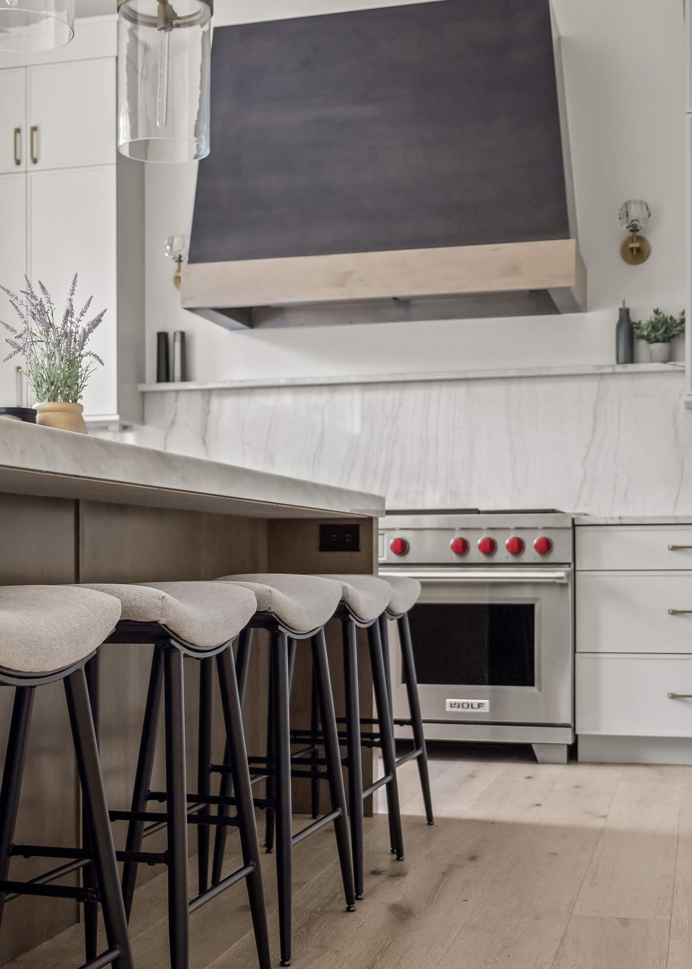 One of the standout features is the custom range hood—a striking “Onyx” black stained finish, framed with sconces and anchored by a quartz ledge. It’s bold but refined, and it immediately draws your eye without overwhelming the room.
