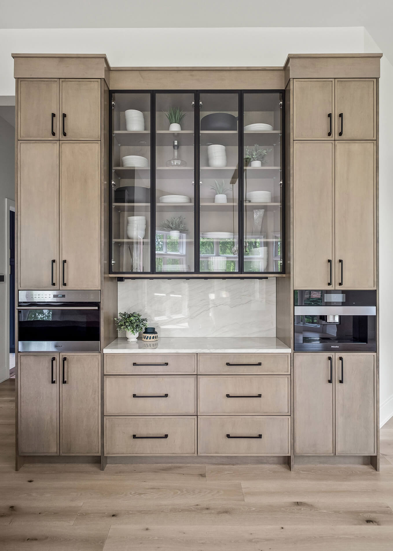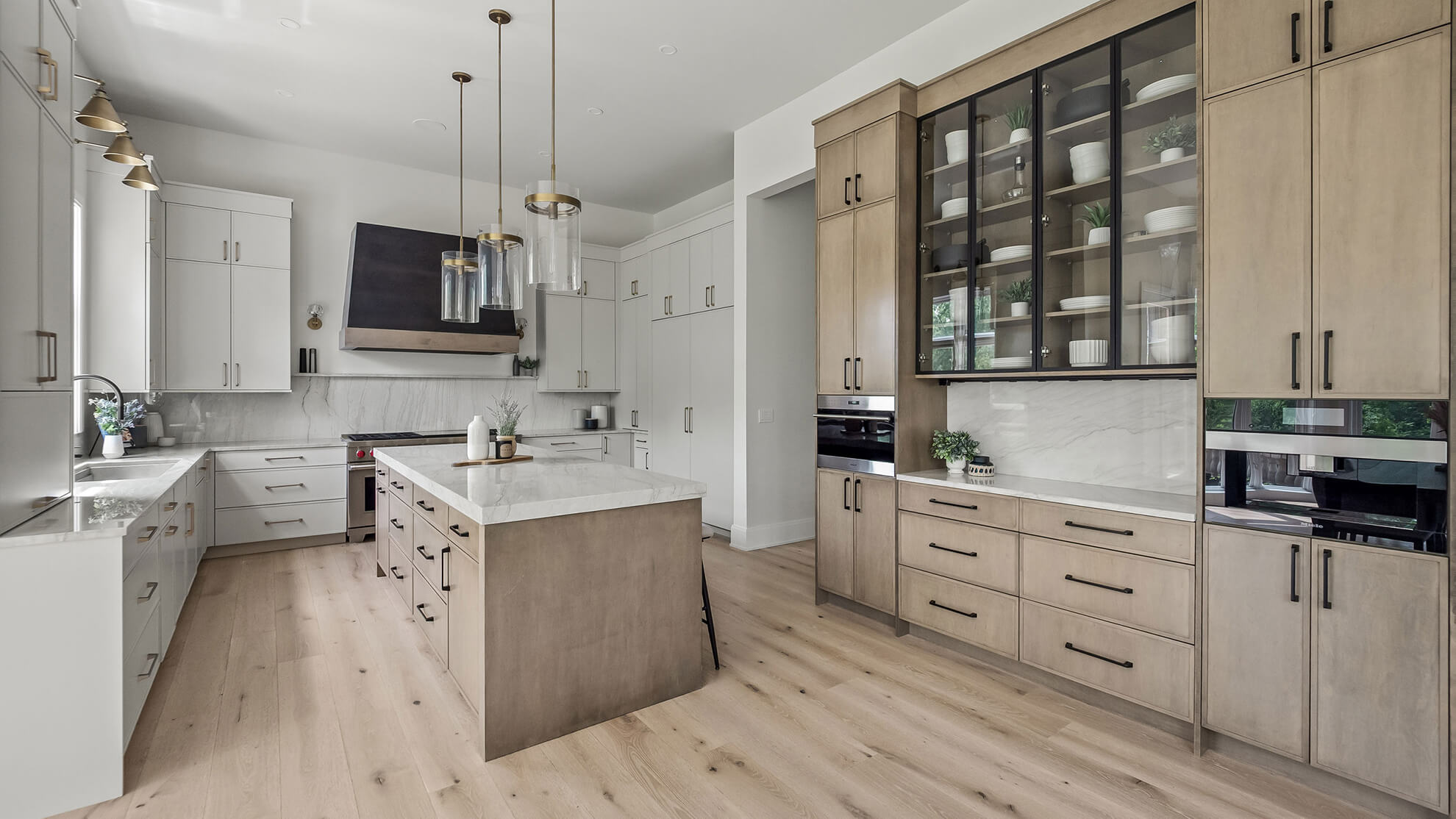 In the heart of the home, we designed a kitchen that feels effortlessly balanced. A soft, natural wood stain on the kitchen island and built-in hutch adds warmth and grounding, while light-painted cabinetry around the perimeter keeps the space bright and airy.