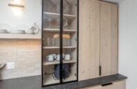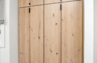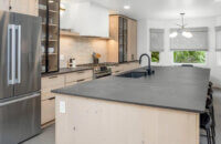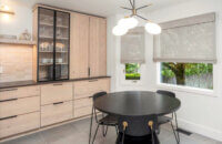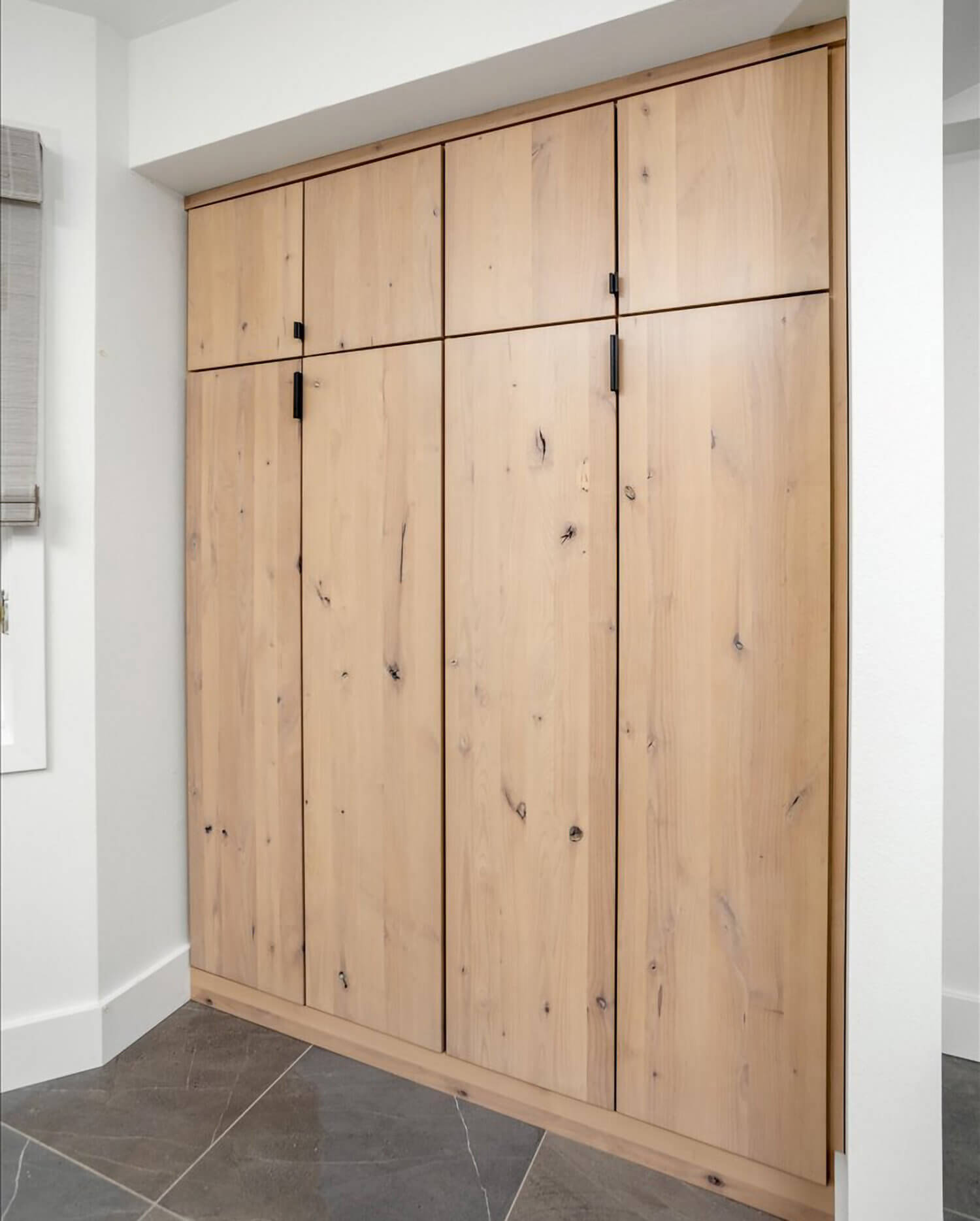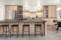 Add warmth to a modern contemporary design with a rustic wood texture like knotty alder. This kitchen features Dura Supreme Cabinetry using the Camden slab door style in the “Alabaster” stain on Knotty Alder.
