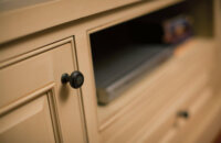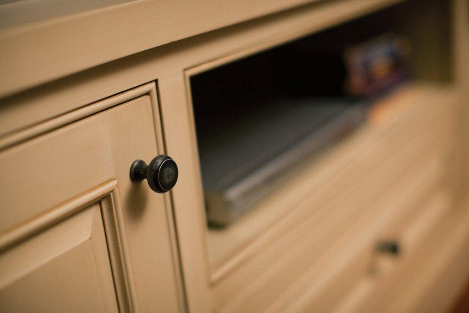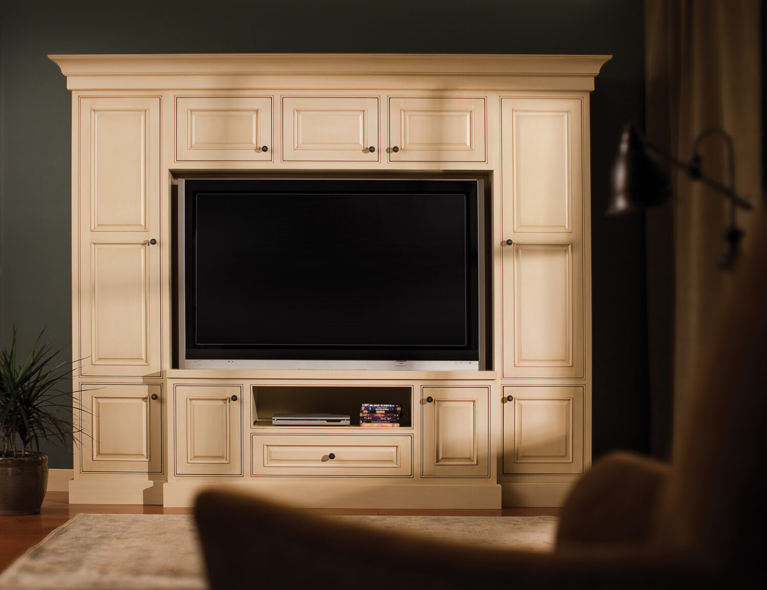 The entertainment center shown here is just one example of the many different looks that can be created with Dura Supreme’s entertainment cabinetry. Featuring the Chapel Hill Classic Inset door style with a beaded frame with a custom off-white paint/glaze finish.