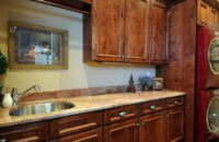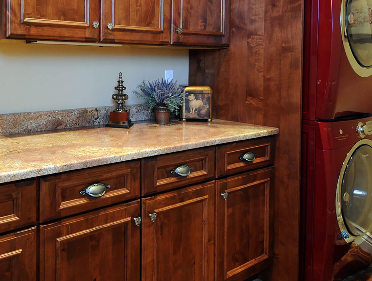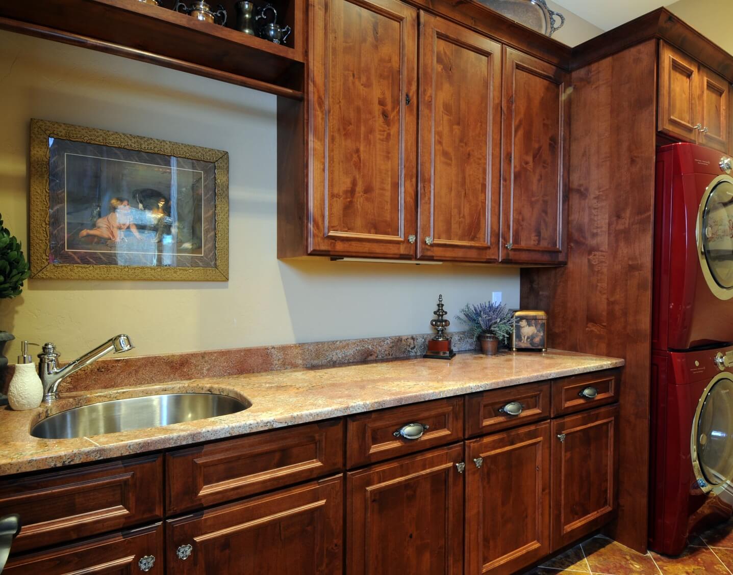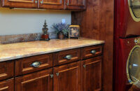 A traditionally styled laundry room remodel with Dura Supreme’s “Mission” Stain on Knotty Alder on the St. Augustine cabinet door style.