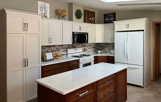 We bought our manufactured home new in 1998. The original cabinets were so poorly made, uneven, and noisy. Twenty-seven years later, I have my dream kitchen! I LOVE my Dura Supreme cabinets! They came in exactly when Becky, from Kitchens Plus, said they would. They arrived in great condition and were installed without any problems. The finish is beautiful, the quality is exceptional, and they are quiet!! Every day I am so thankful for my new kitchen!!